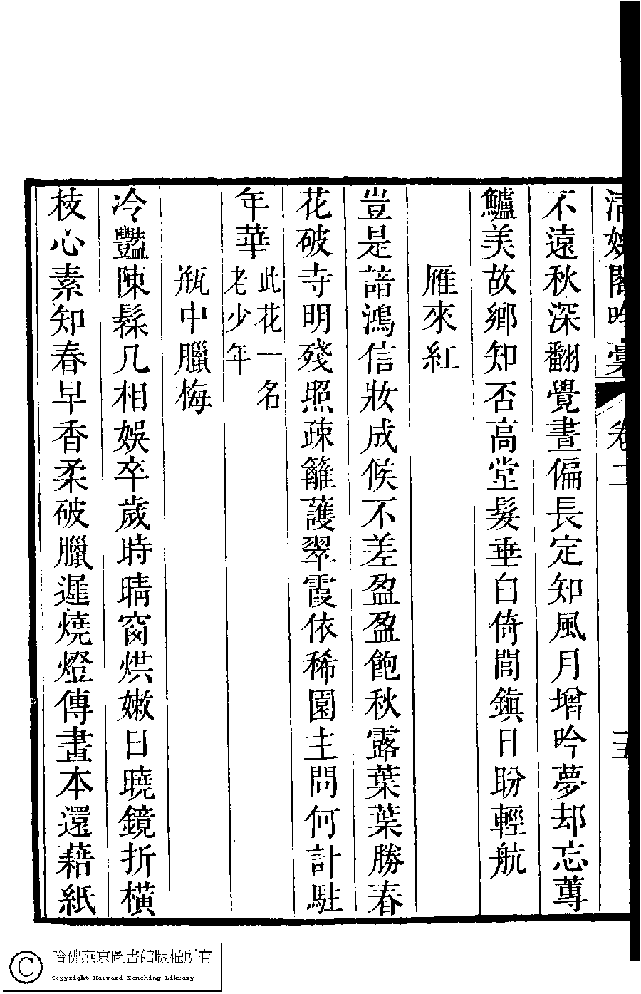 | (PRINT FRIENDLY VERSION) 清娛閣吟稾﹕六卷(清鮑之蕙撰)。嘉慶16年 [1811]刻本 ![]() Page : 2.16a | click for larger image | 清娛閣吟稾﹕六卷(清鮑之蕙撰)。嘉慶16年 [1811]刻本![]() Page : 2.15b | click for larger image | Back |