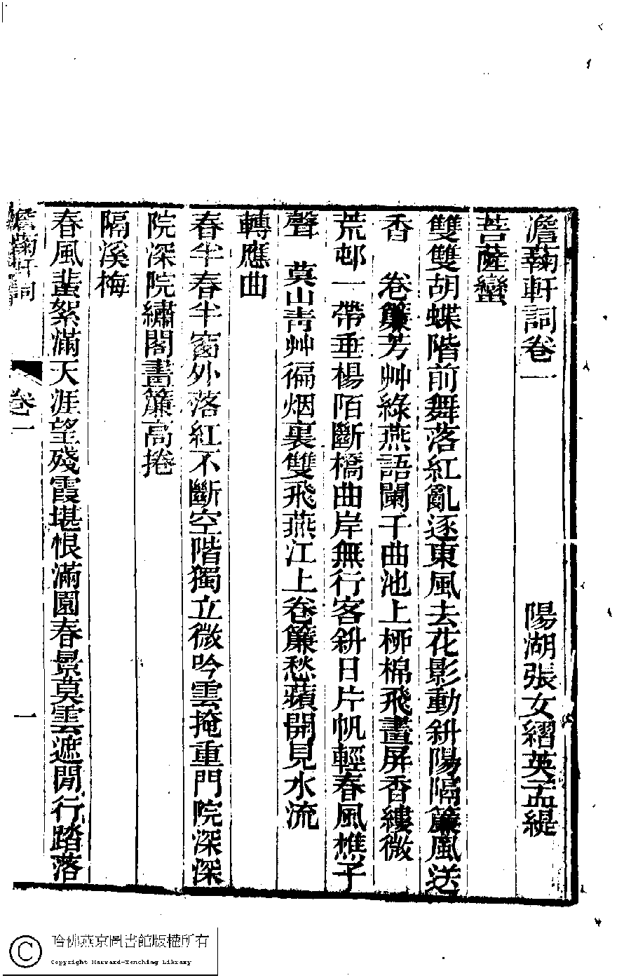 | (PRINT FRIENDLY VERSION) 澹蘜軒詩初稿﹕四卷﹐詞﹕一卷(清張䌌英撰)。道光二十年(1840)刻本。 ![]() Page : 詞.1a | click for larger image | Back |