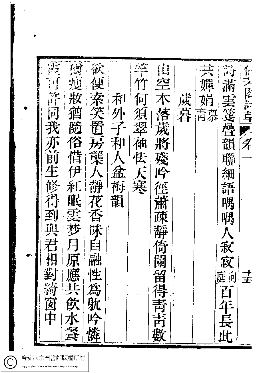 | (PRINT FRIENDLY VERSION) 信芳閣詩草﹕五卷(清陳蘊蓮撰)。清咸豐九年(1859)刻本。 ![]() Page : 1.15b | click for larger image | 信芳閣詩草﹕五卷(清陳蘊蓮撰)。清咸豐九年(1859)刻本。![]() Page : 1.15a | click for larger image | Back |