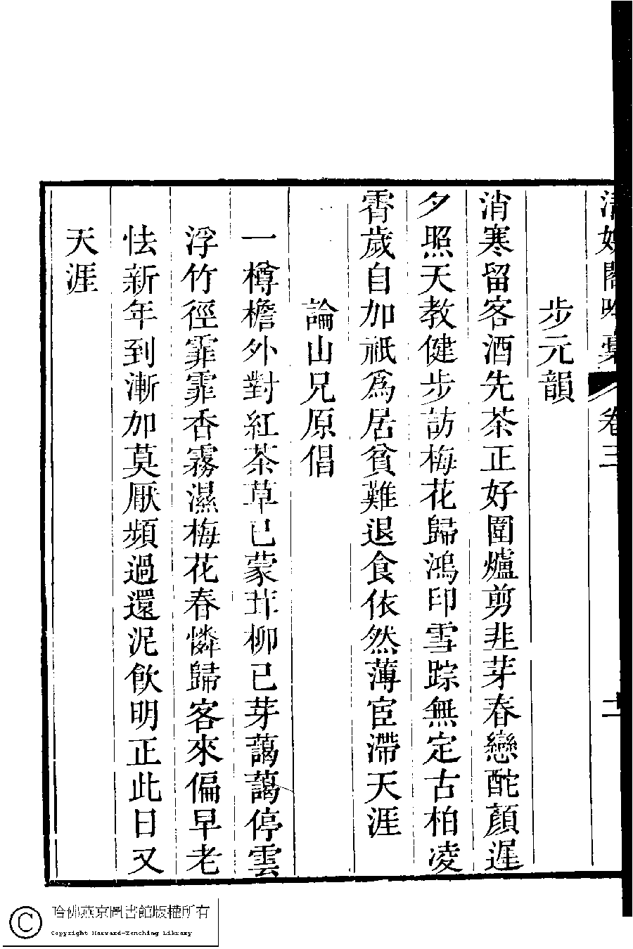| (PRINT FRIENDLY VERSION) 清娛閣吟稾﹕六卷(清鮑之蕙撰)。嘉慶16年 [1811]刻本 ![]() Page : 3.11b | click for larger image | 清娛閣吟稾﹕六卷(清鮑之蕙撰)。嘉慶16年 [1811]刻本![]() Page : 3.11a | click for larger image | Back |