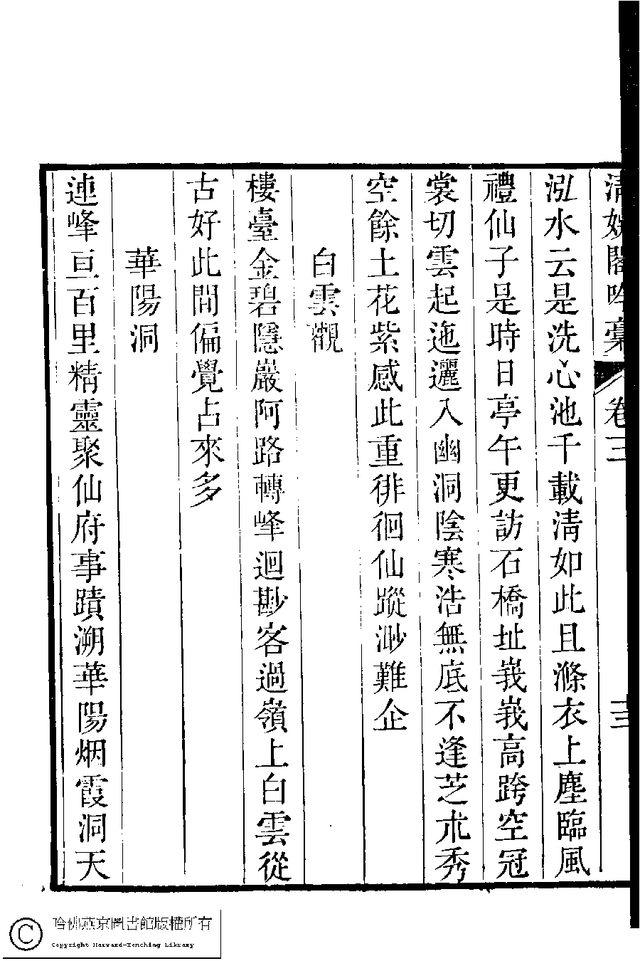 | (PRINT FRIENDLY VERSION) 清娛閣吟稾﹕六卷(清鮑之蕙撰)。嘉慶16年 [1811]刻本 ![]() Page : 3.13b | click for larger image | Back |