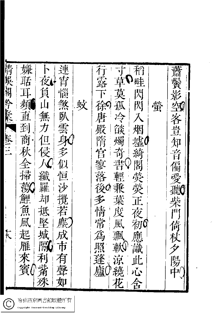 | (PRINT FRIENDLY VERSION) 清娛閣吟稾﹕六卷(清鮑之蕙撰)。嘉慶16年 [1811]刻本 ![]() Page : 3.18a | click for larger image | 清娛閣吟稾﹕六卷(清鮑之蕙撰)。嘉慶16年 [1811]刻本![]() Page : 3.17b | click for larger image | Back |
