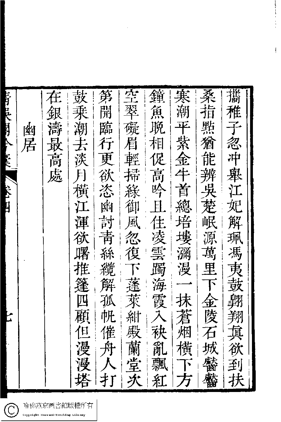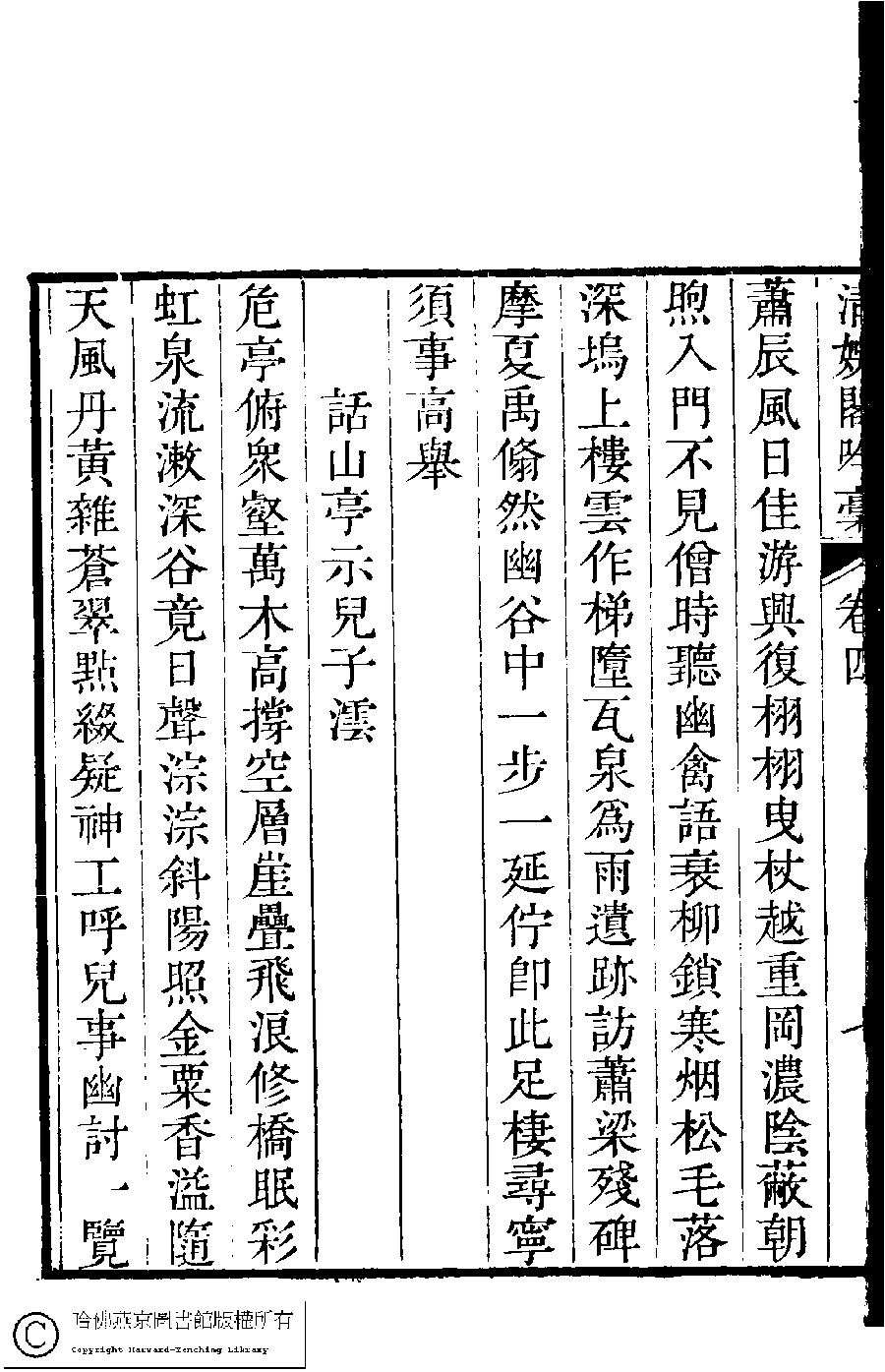 | (PRINT FRIENDLY VERSION) 清娛閣吟稾﹕六卷(清鮑之蕙撰)。嘉慶16年 [1811]刻本 ![]() Page : 4.7b | click for larger image | 清娛閣吟稾﹕六卷(清鮑之蕙撰)。嘉慶16年 [1811]刻本![]() Page : 4.7a | click for larger image | Back |