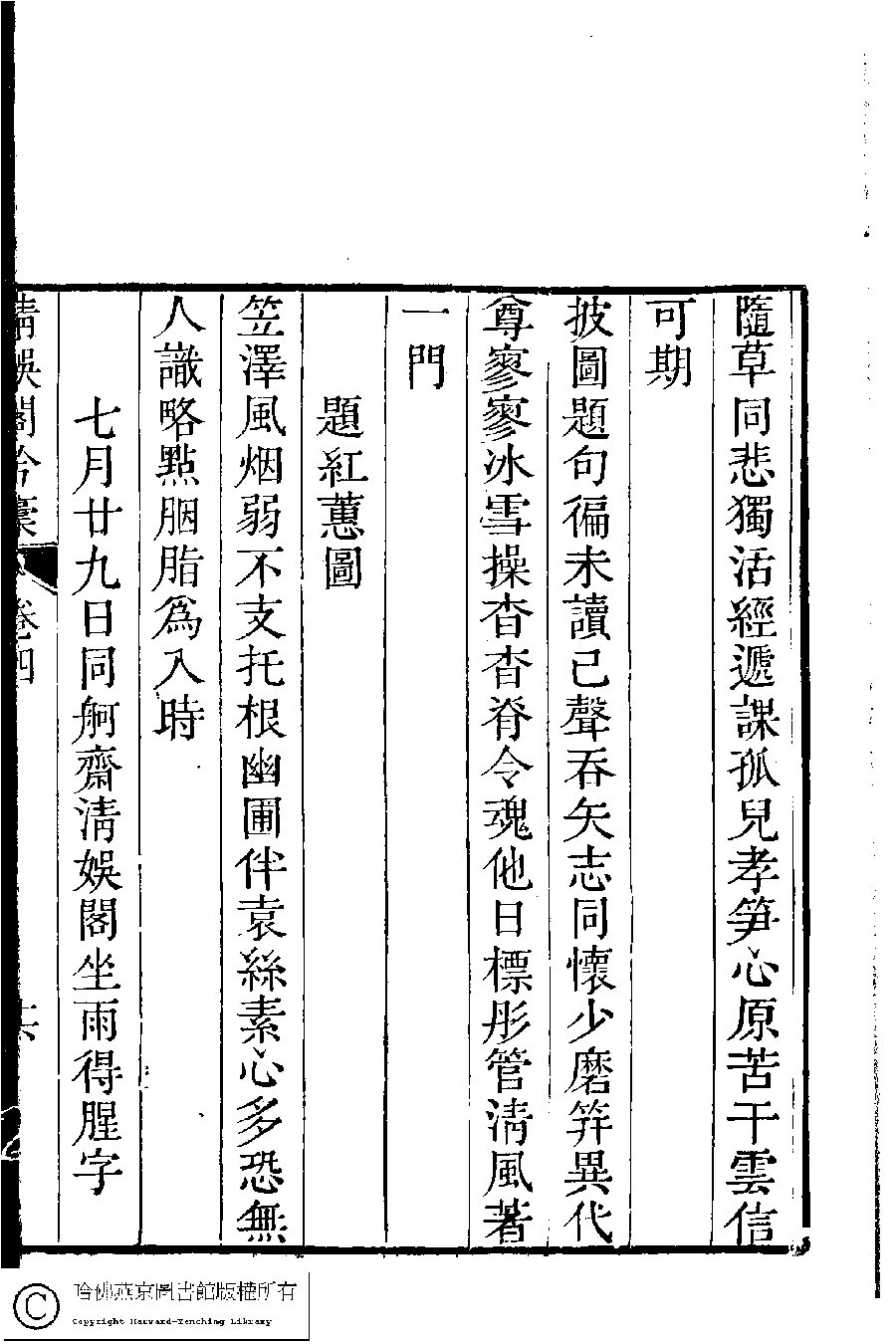 | (PRINT FRIENDLY VERSION) 清娛閣吟稾﹕六卷(清鮑之蕙撰)。嘉慶16年 [1811]刻本 ![]() Page : 4.16a | click for larger image | Back |