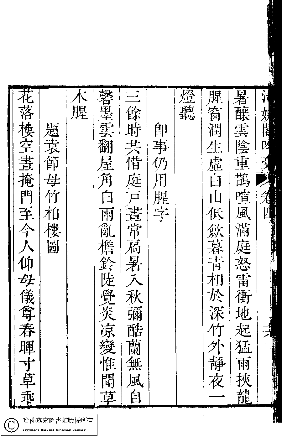 | (PRINT FRIENDLY VERSION) 清娛閣吟稾﹕六卷(清鮑之蕙撰)。嘉慶16年 [1811]刻本 ![]() Page : 4.16b | click for larger image | Back |