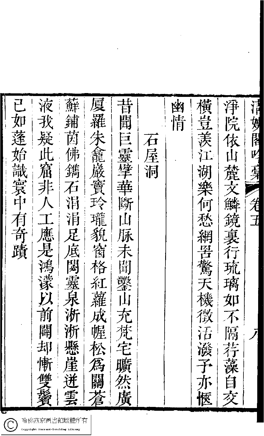 | (PRINT FRIENDLY VERSION) 清娛閣吟稾﹕六卷(清鮑之蕙撰)。嘉慶16年 [1811]刻本 ![]() Page : 5.8b | click for larger image | Back |
