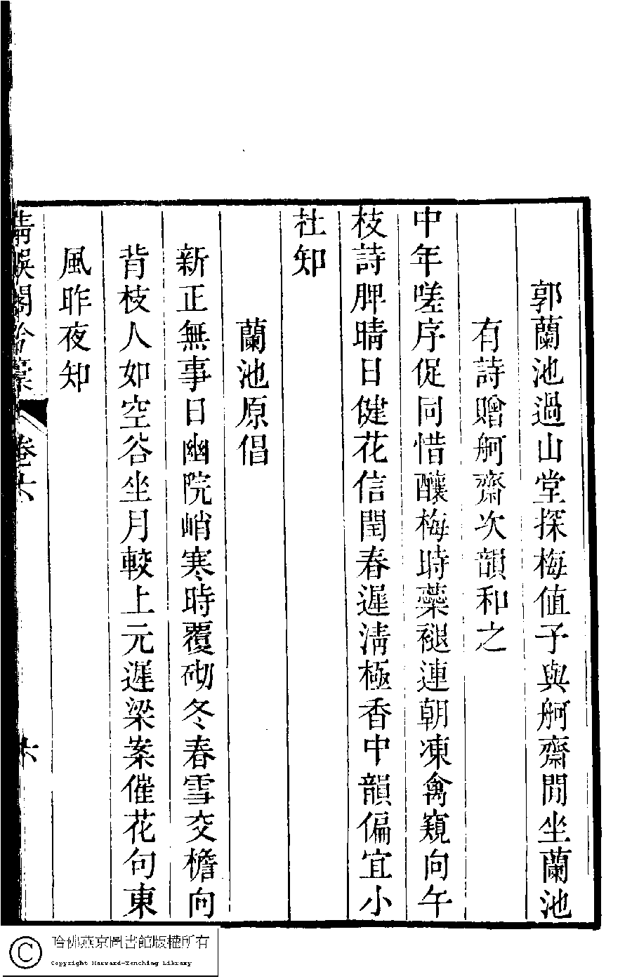 | (PRINT FRIENDLY VERSION) 清娛閣吟稾﹕六卷(清鮑之蕙撰)。嘉慶16年 [1811]刻本 ![]() Page : 6.6a | click for larger image | Back |