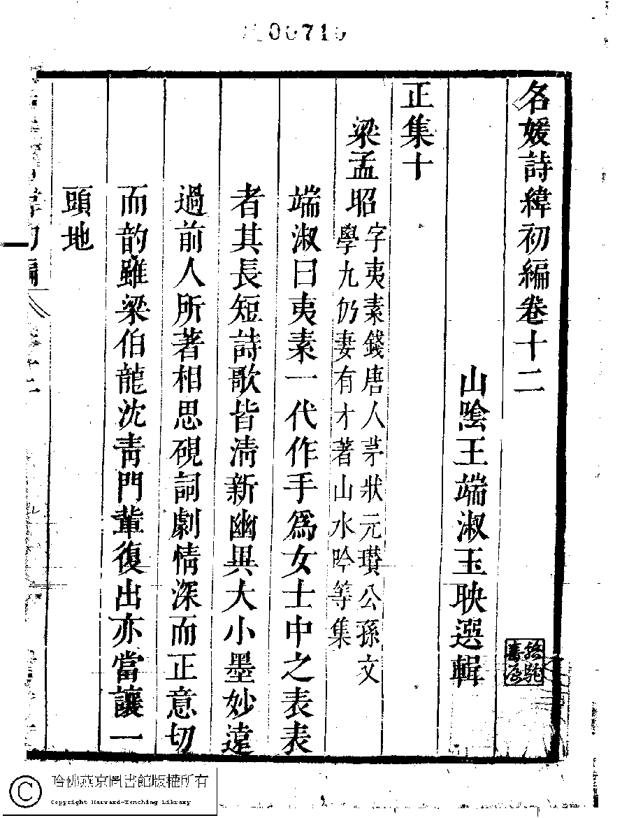 | (PRINT FRIENDLY VERSION) 名媛詩緯初編(清王端淑輯)。清康熙六年(1667)清音堂刻本 ![]() Page : 12.1a | click for larger image | Back |