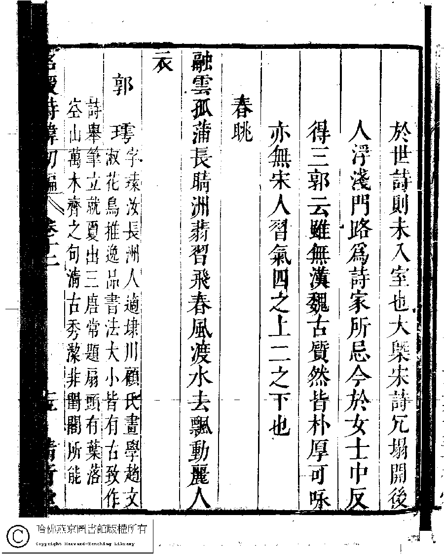 | (PRINT FRIENDLY VERSION) 名媛詩緯初編(清王端淑輯)。清康熙六年(1667)清音堂刻本 ![]() Page : 12.15a | click for larger image | Back |