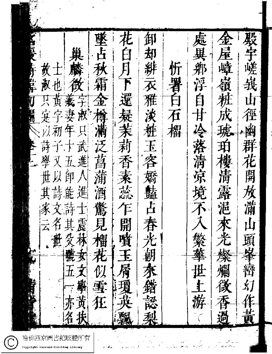 | (PRINT FRIENDLY VERSION) 名媛詩緯初編(清王端淑輯)。清康熙六年(1667)清音堂刻本 ![]() Page : 12.19a | click for larger image | Back |