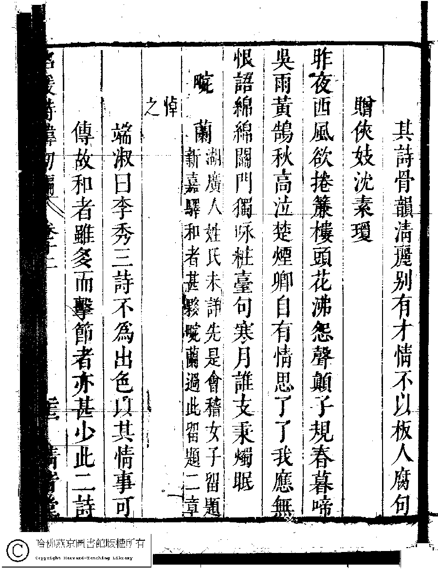 | (PRINT FRIENDLY VERSION) 名媛詩緯初編(清王端淑輯)。清康熙六年(1667)清音堂刻本 ![]() Page : 12.22a | click for larger image | Back |