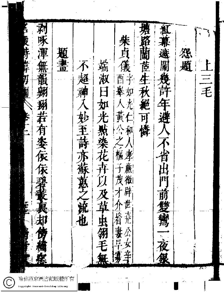 | (PRINT FRIENDLY VERSION) 名媛詩緯初編(清王端淑輯)。清康熙六年(1667)清音堂刻本 ![]() Page : 12.23a | click for larger image | Back |