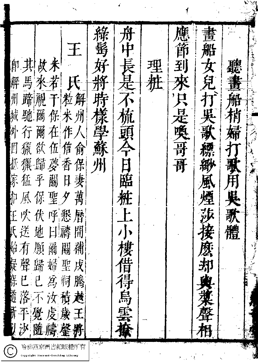 | (PRINT FRIENDLY VERSION) 名媛詩緯初編(清王端淑輯)。清康熙六年(1667)清音堂刻本 ![]() Page : 6.14a | click for larger image | 名媛詩緯初編(清王端淑輯)。清康熙六年(1667)清音堂刻本![]() Page : 6.13b | click for larger image | Back |