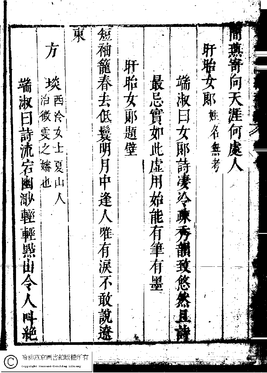 | (PRINT FRIENDLY VERSION) 名媛詩緯初編(清王端淑輯)。清康熙六年(1667)清音堂刻本 ![]() Page : 7.22b | click for larger image | Back |