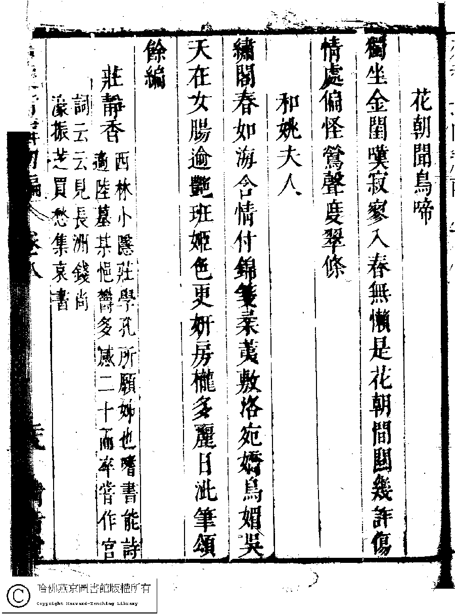| (PRINT FRIENDLY VERSION) 名媛詩緯初編(清王端淑輯)。清康熙六年(1667)清音堂刻本 ![]() Page : 8.29a | click for larger image | Back |