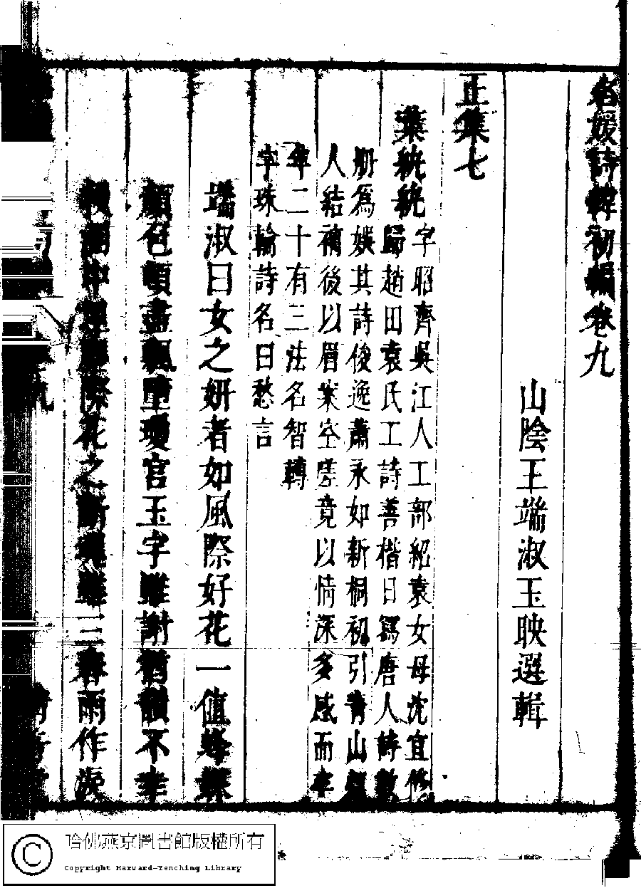 | (PRINT FRIENDLY VERSION) 名媛詩緯初編(清王端淑輯)。清康熙六年(1667)清音堂刻本 ![]() Page : 9.1a | click for larger image | Back |