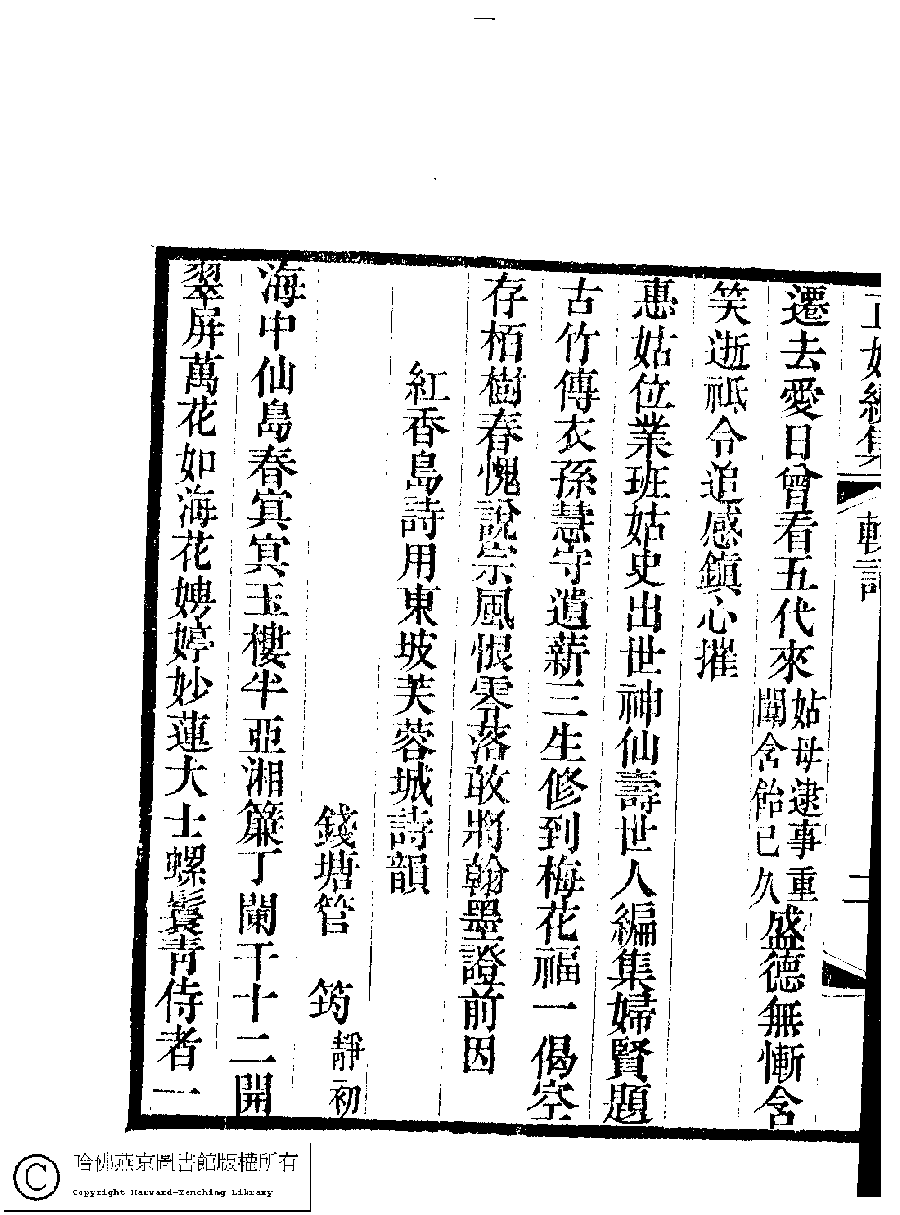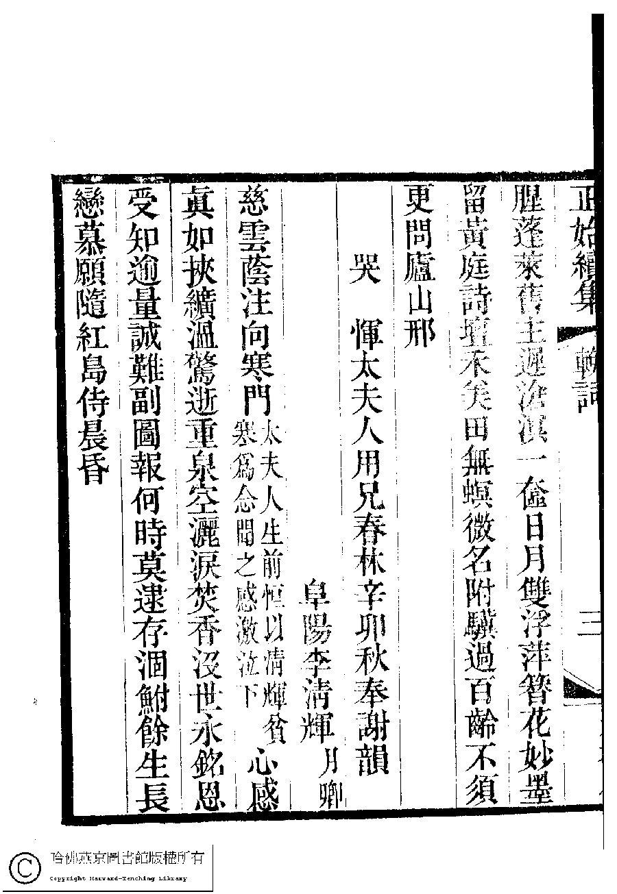 | (PRINT FRIENDLY VERSION) 國朝閨秀正始續集﹕十卷﹐附錄﹕一卷﹐補遺﹕一卷﹐輓詞﹕一卷(清惲珠輯)。清道光十六年(1836)紅香館刻本。 ![]() Page : 輓詞.3b | click for larger image | 國朝閨秀正始續集﹕十卷﹐附錄﹕一卷﹐補遺﹕一卷﹐輓詞﹕一卷(清惲珠輯)。清道光十六年(1836)紅香館刻本。![]() Page : 輓詞.3a | click for larger image | 國朝閨秀正始續集﹕十卷﹐附錄﹕一卷﹐補遺﹕一卷﹐輓詞﹕一卷(清惲珠輯)。清道光十六年(1836)紅香館刻本。![]() Page : 輓詞.2b | click for larger image | Back |