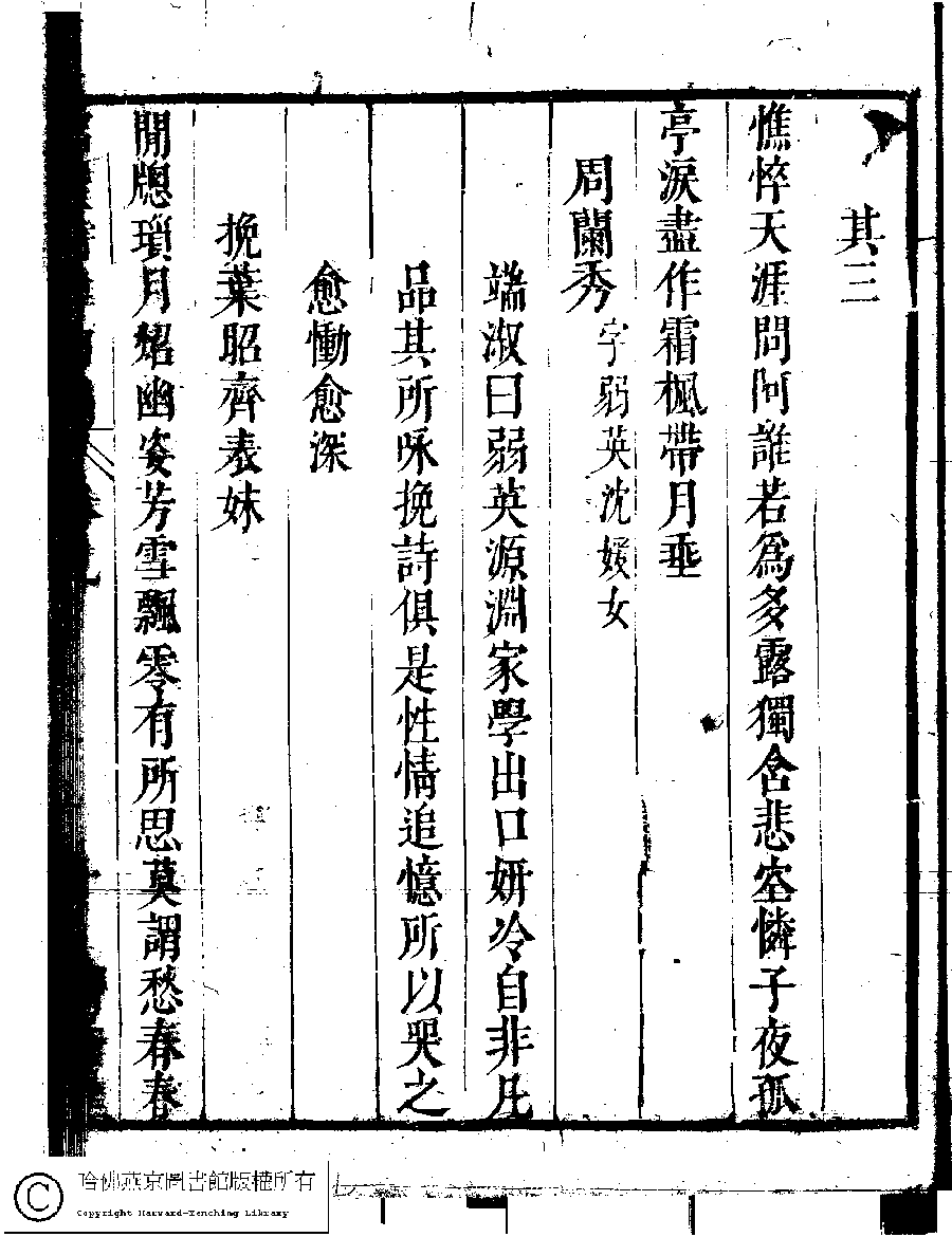 | (PRINT FRIENDLY VERSION) 名媛詩緯初編(清王端淑輯)。清康熙六年(1667)清音堂刻本 ![]() Page : 9.10a | click for larger image | Back |