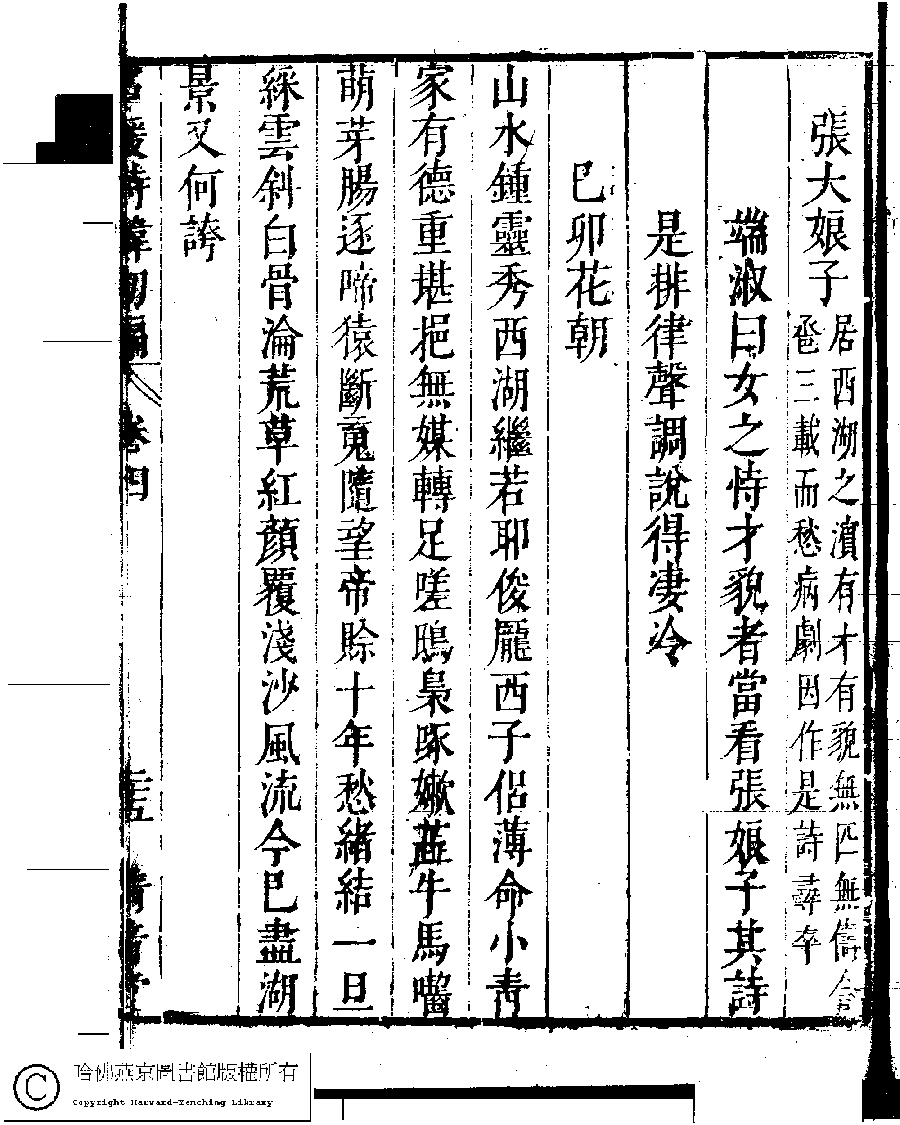 | (PRINT FRIENDLY VERSION) 名媛詩緯初編(清王端淑輯)。清康熙六年(1667)清音堂刻本 ![]() Page : 4.25a | click for larger image | Back |