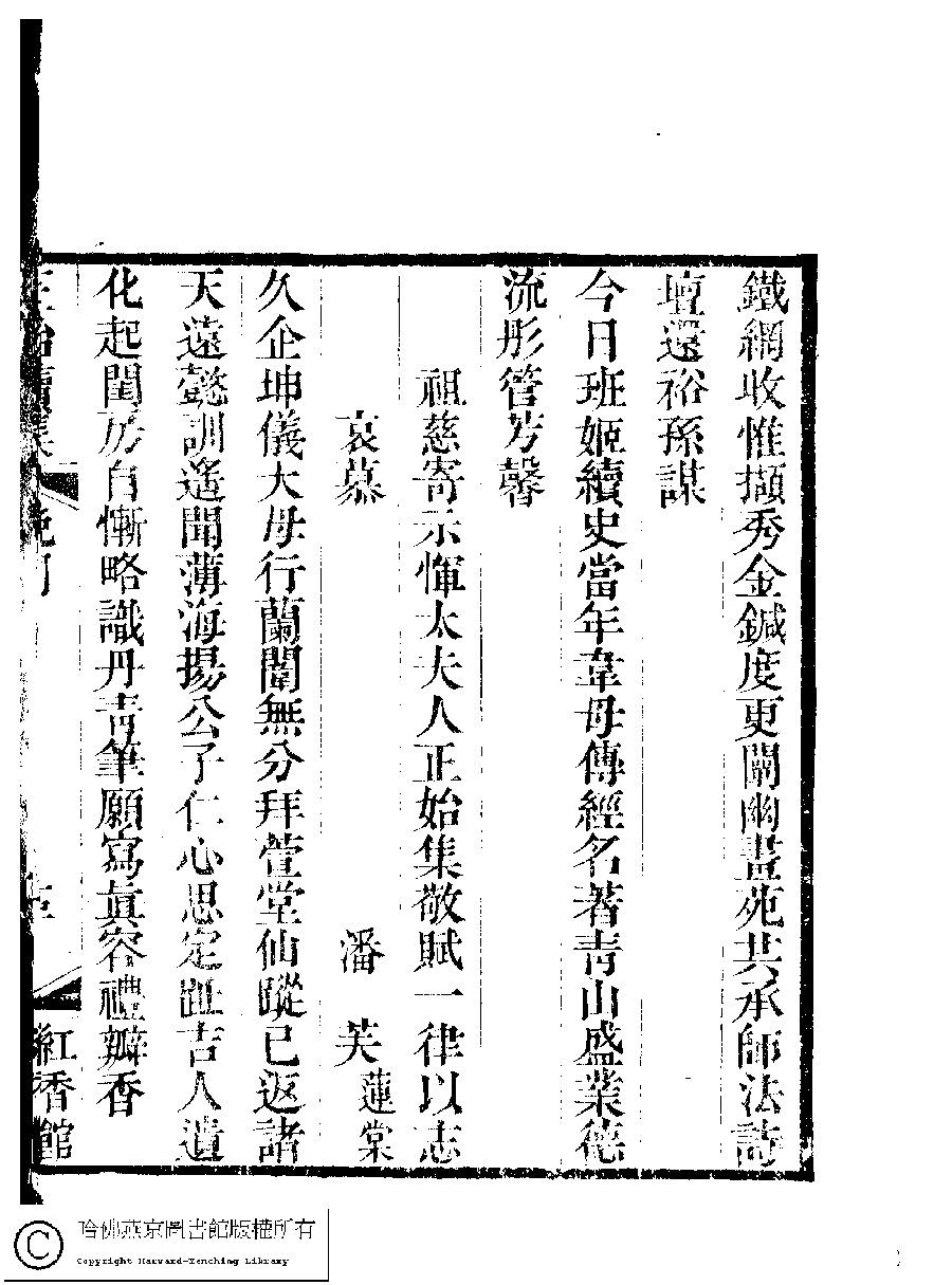 | (PRINT FRIENDLY VERSION) 國朝閨秀正始續集﹕十卷﹐附錄﹕一卷﹐補遺﹕一卷﹐輓詞﹕一卷(清惲珠輯)。清道光十六年(1836)紅香館刻本。 ![]() Page : 輓詞.13a | click for larger image | Back |