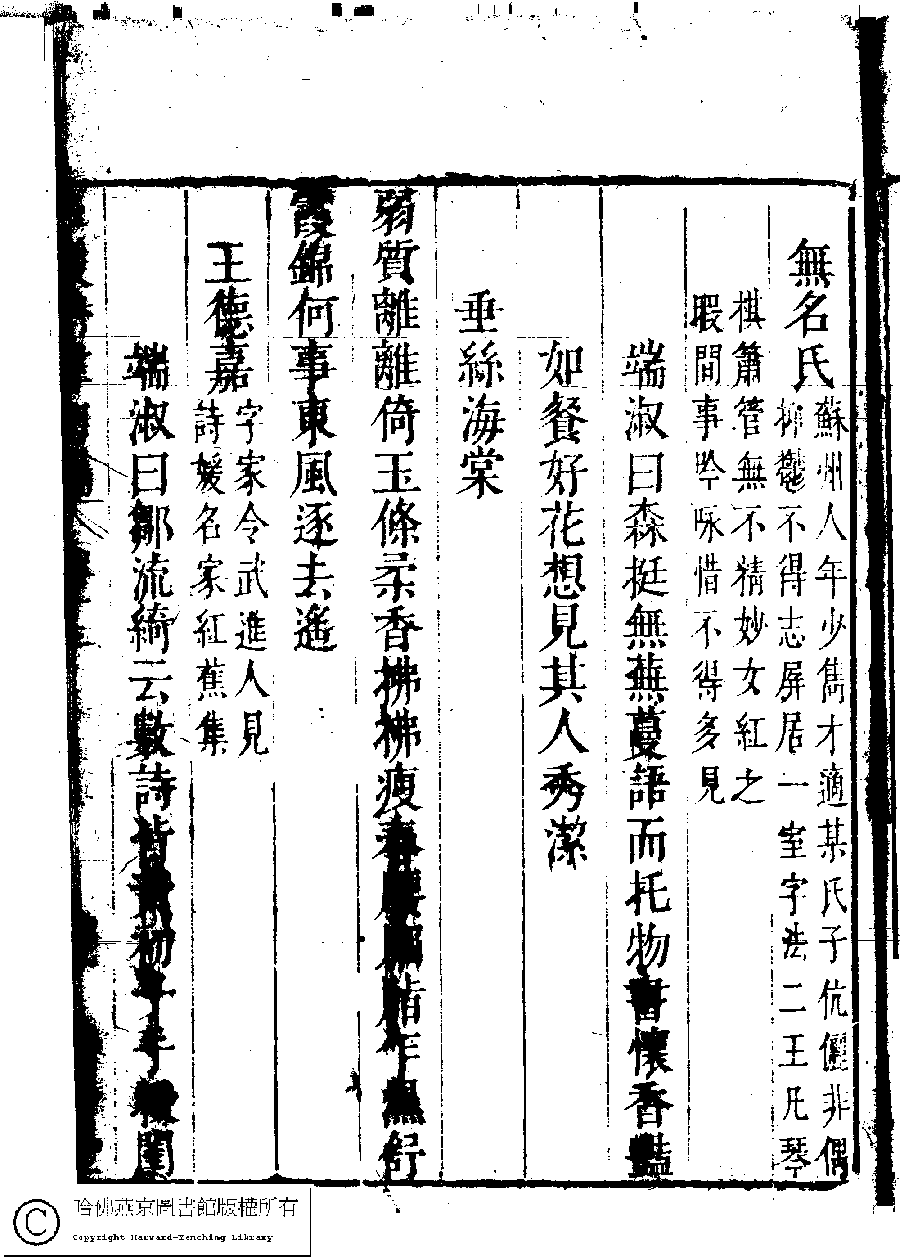 | (PRINT FRIENDLY VERSION) 名媛詩緯初編(清王端淑輯)。清康熙六年(1667)清音堂刻本 ![]() Page : 13.49a | click for larger image | Back |