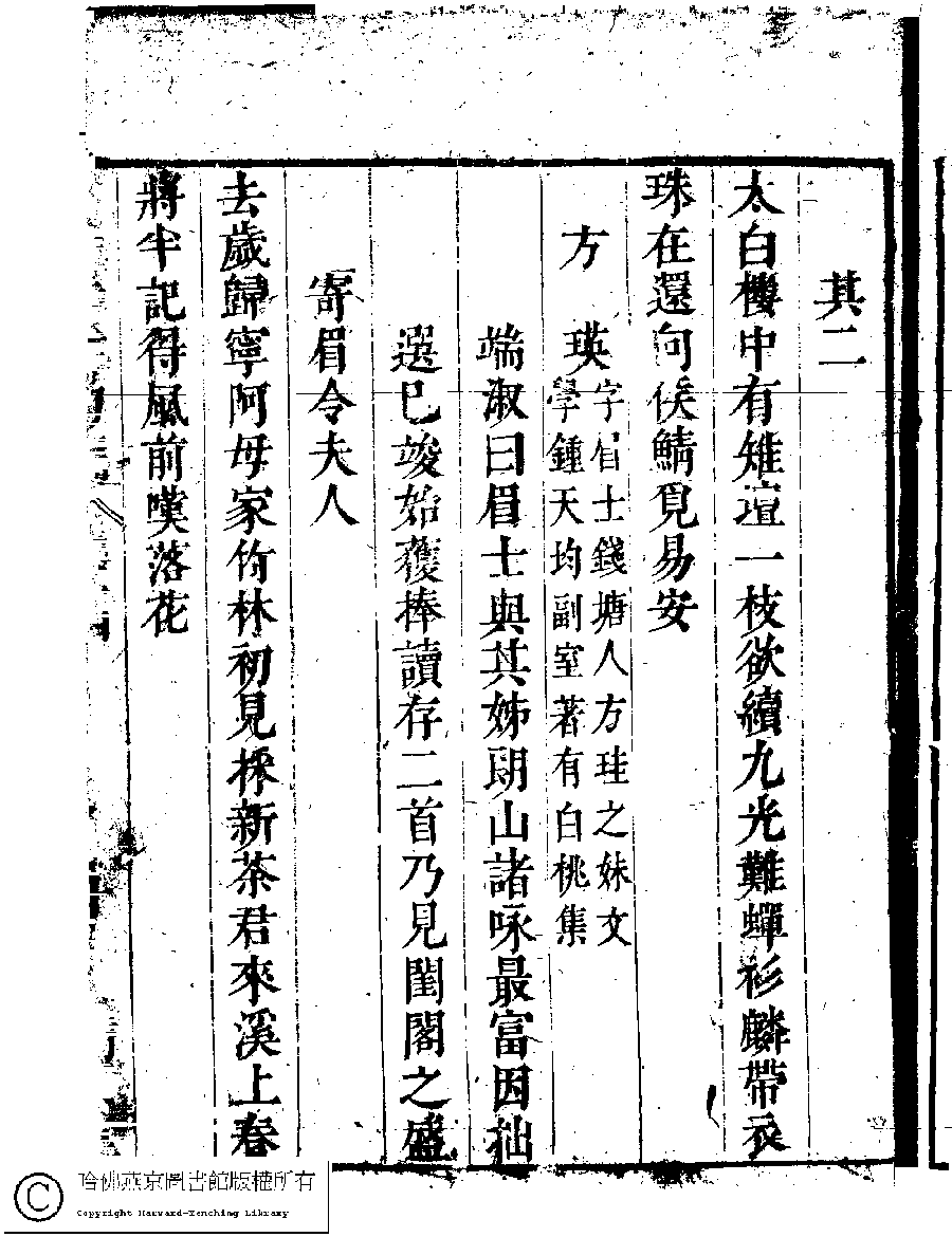 | (PRINT FRIENDLY VERSION) 名媛詩緯初編(清王端淑輯)。清康熙六年(1667)清音堂刻本 ![]() Page : 14.10a | click for larger image | Back |