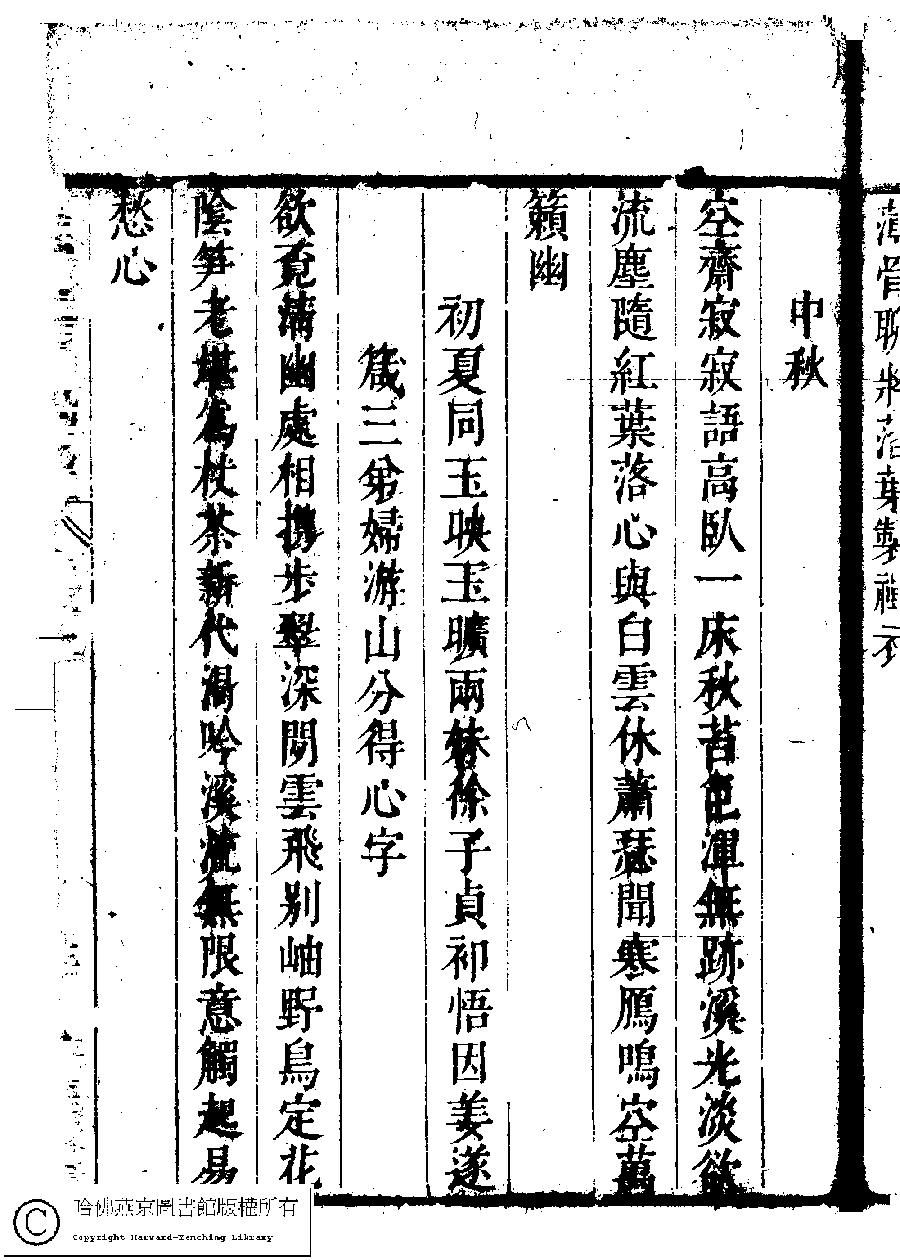 | (PRINT FRIENDLY VERSION) 名媛詩緯初編(清王端淑輯)。清康熙六年(1667)清音堂刻本 ![]() Page : 15.7a | click for larger image | Back |
