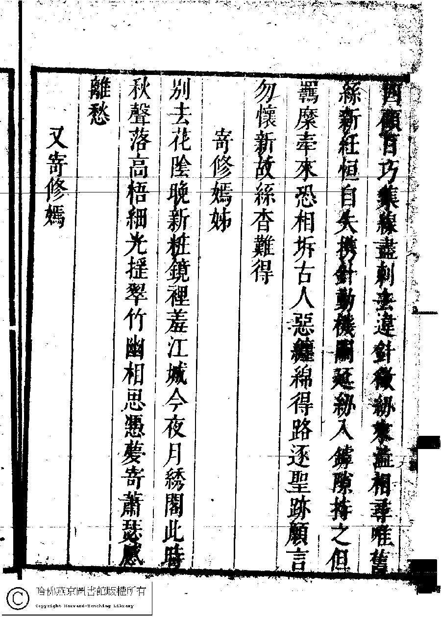 | (PRINT FRIENDLY VERSION) 名媛詩緯初編(清王端淑輯)。清康熙六年(1667)清音堂刻本 ![]() Page : 16.16b | click for larger image | Back |