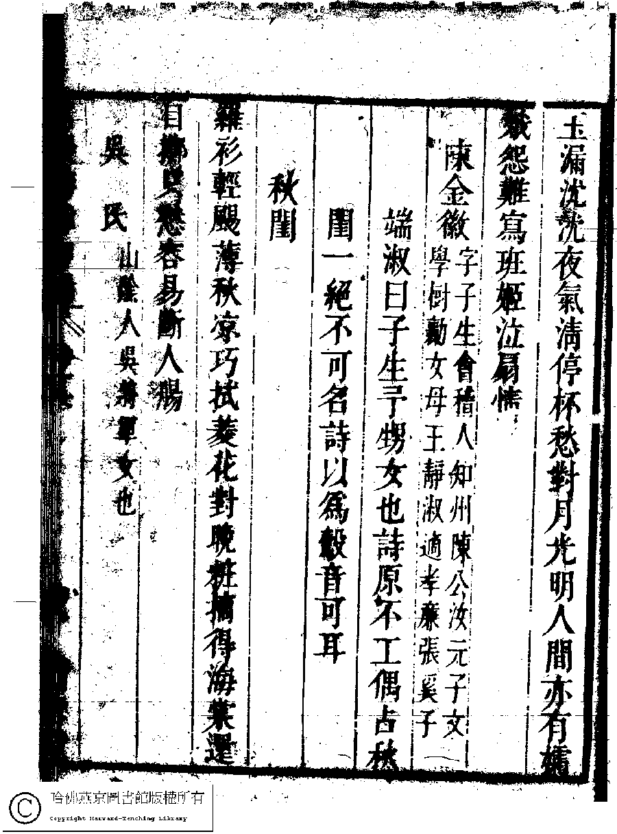 | (PRINT FRIENDLY VERSION) 名媛詩緯初編(清王端淑輯)。清康熙六年(1667)清音堂刻本 ![]() Page : 16.18a | click for larger image | Back |