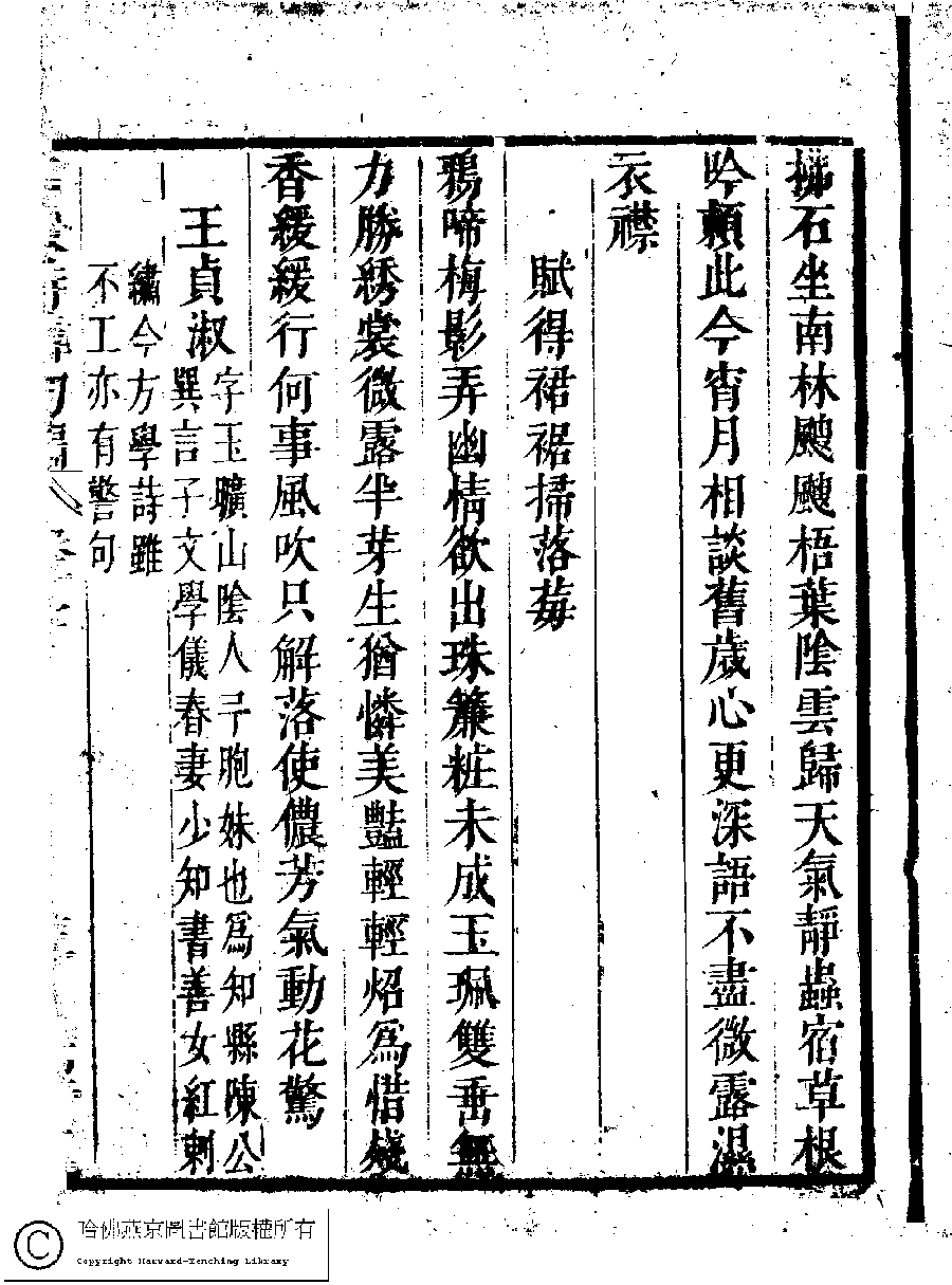 | (PRINT FRIENDLY VERSION) 名媛詩緯初編(清王端淑輯)。清康熙六年(1667)清音堂刻本 ![]() Page : 17.3a | click for larger image | Back |