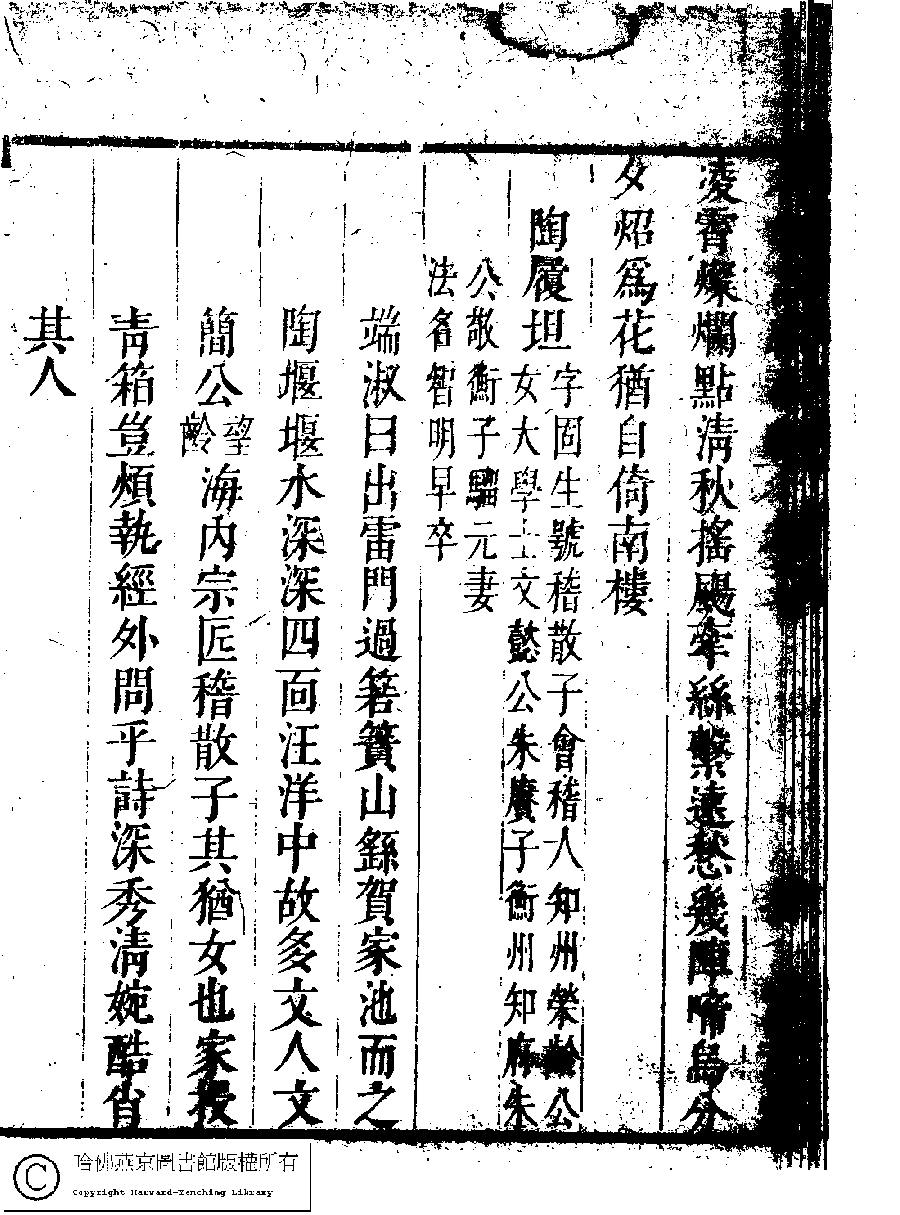 | (PRINT FRIENDLY VERSION) 名媛詩緯初編(清王端淑輯)。清康熙六年(1667)清音堂刻本 ![]() Page : 17.7b | click for larger image | Back |