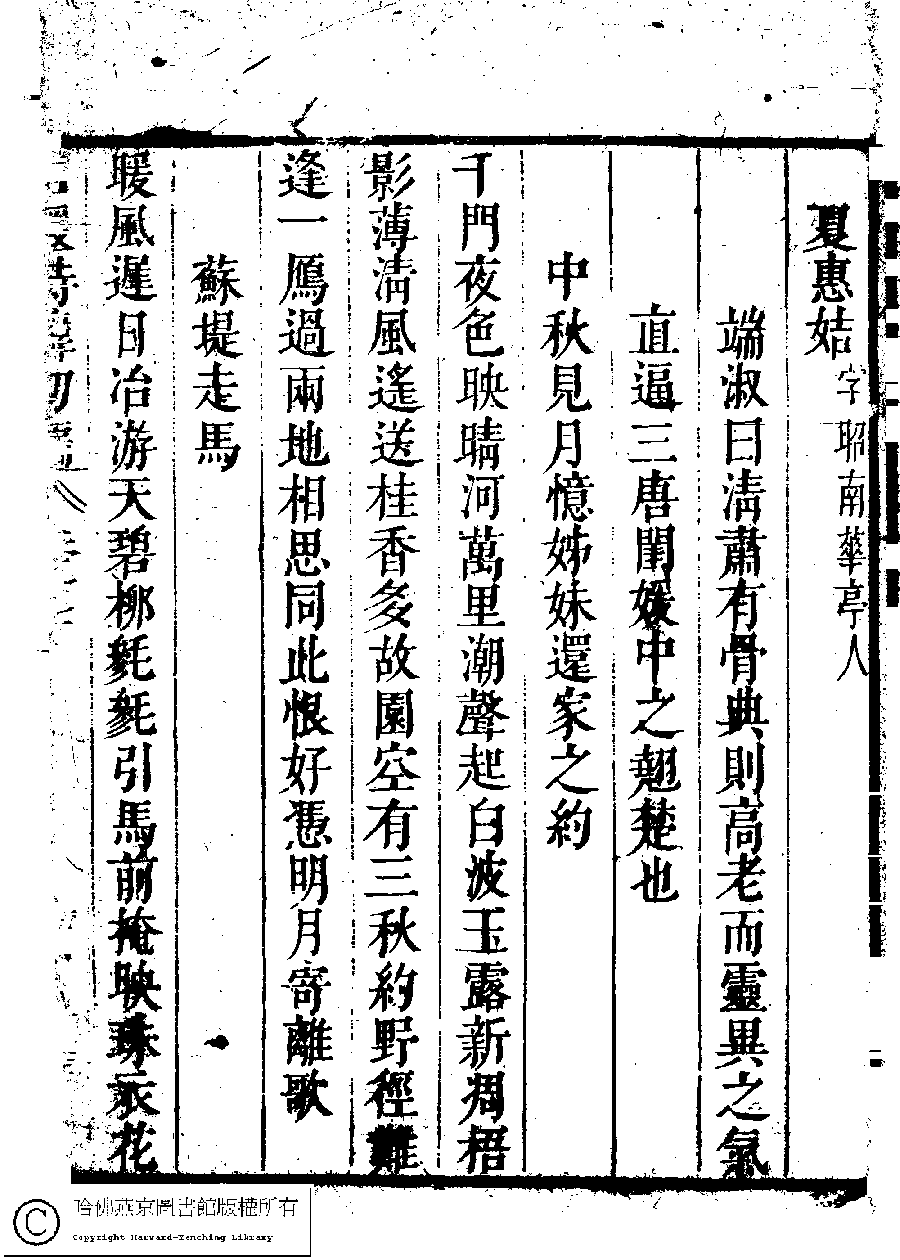 | (PRINT FRIENDLY VERSION) 名媛詩緯初編(清王端淑輯)。清康熙六年(1667)清音堂刻本 ![]() Page : 17.14a | click for larger image | Back |