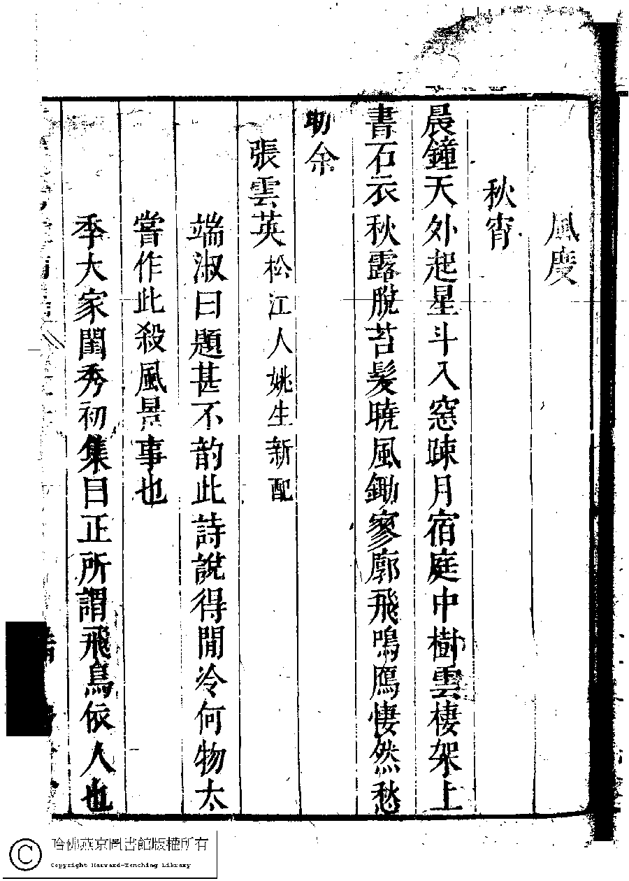 | (PRINT FRIENDLY VERSION) 名媛詩緯初編(清王端淑輯)。清康熙六年(1667)清音堂刻本 ![]() Page : 17.24a | click for larger image | Back |