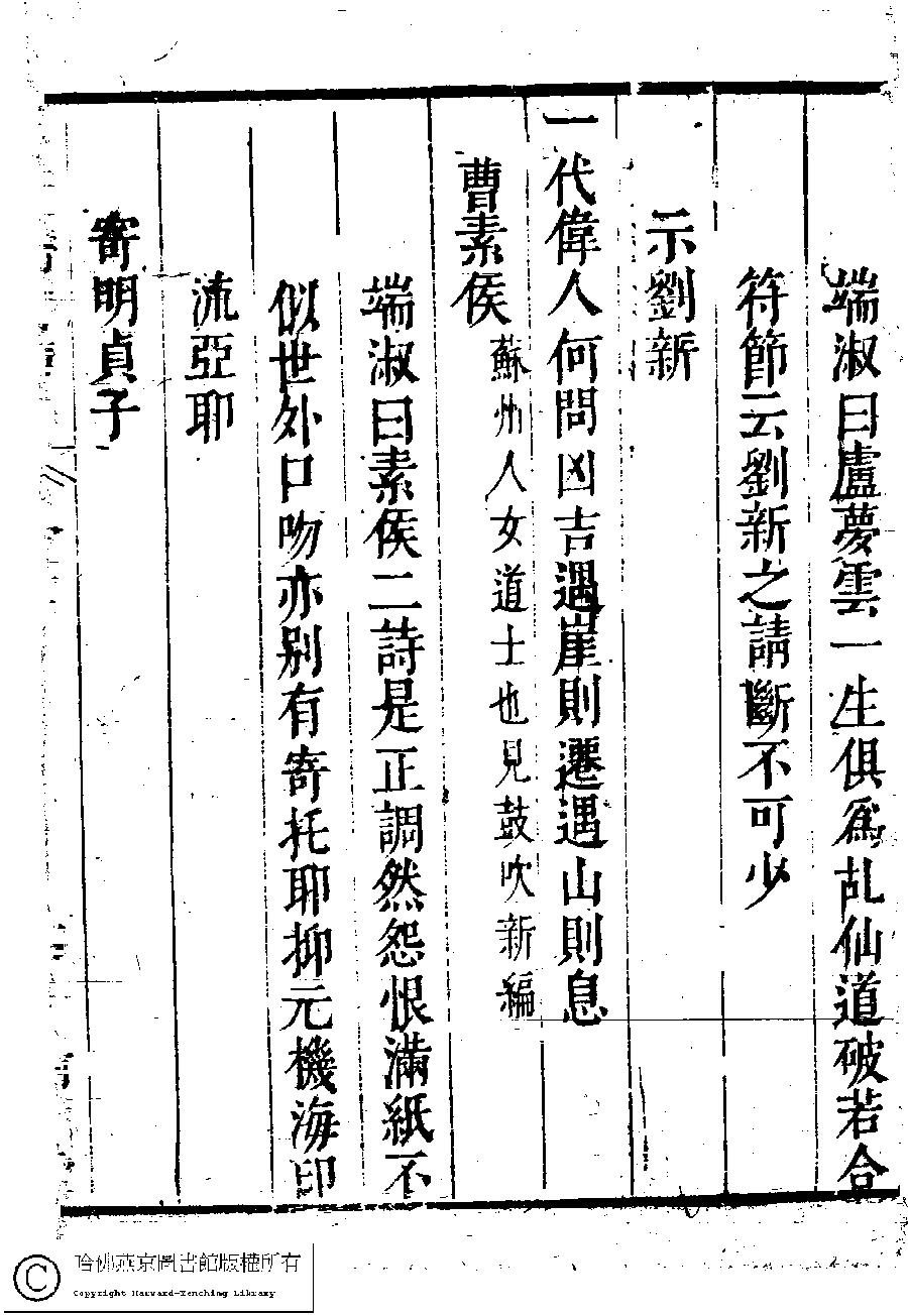 | (PRINT FRIENDLY VERSION) 名媛詩緯初編(清王端淑輯)。清康熙六年(1667)清音堂刻本 ![]() Page : 27.4a | click for larger image | Back |