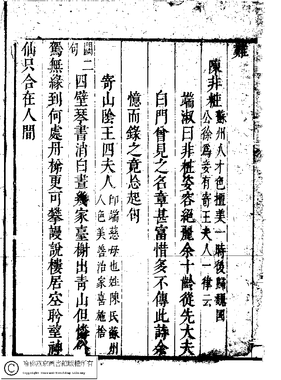 | (PRINT FRIENDLY VERSION) 名媛詩緯初編(清王端淑輯)。清康熙六年(1667)清音堂刻本 ![]() Page : 19.9b | click for larger image | Back |
