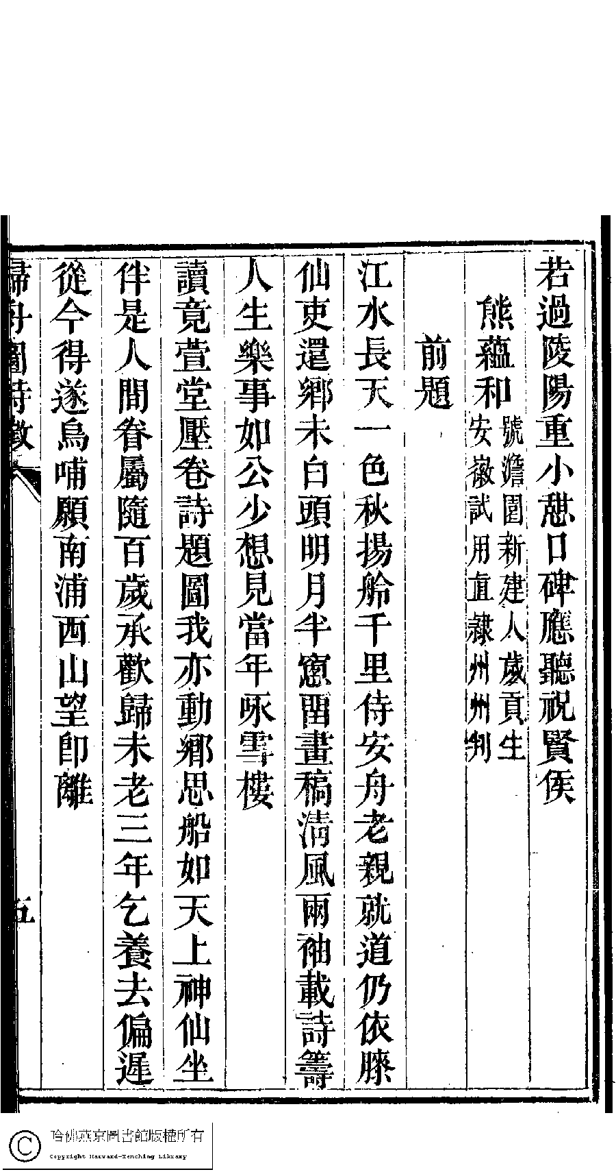 | (PRINT FRIENDLY VERSION) 詠雪樓稿﹕五卷,卷首一卷,附一卷(清甘立媃撰)。清道光二十三年(1843)徐心田半偈齋刻本。 ![]() Page : 5.詩徵.5a | click for larger image | Back |