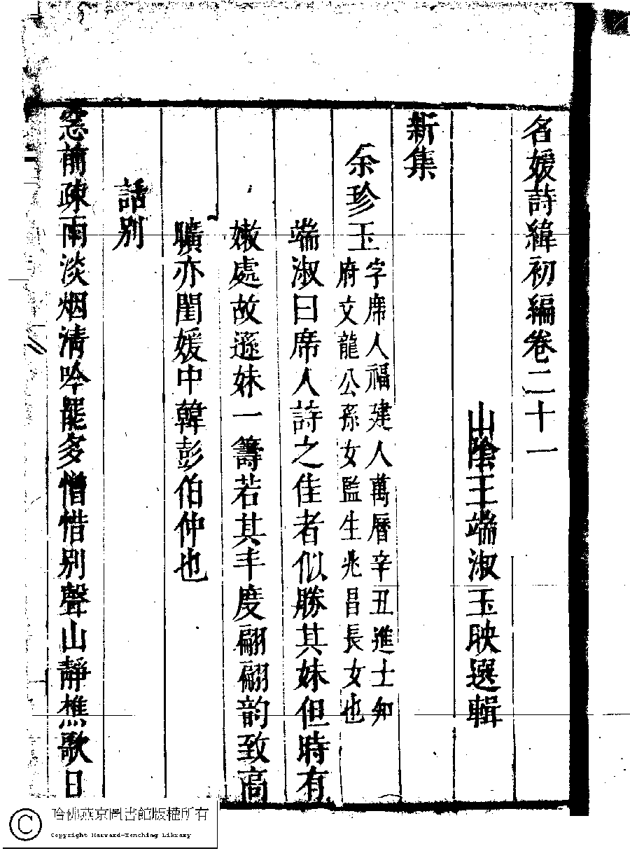 | (PRINT FRIENDLY VERSION) 名媛詩緯初編(清王端淑輯)。清康熙六年(1667)清音堂刻本 ![]() Page : 21.1a | click for larger image | Back |
