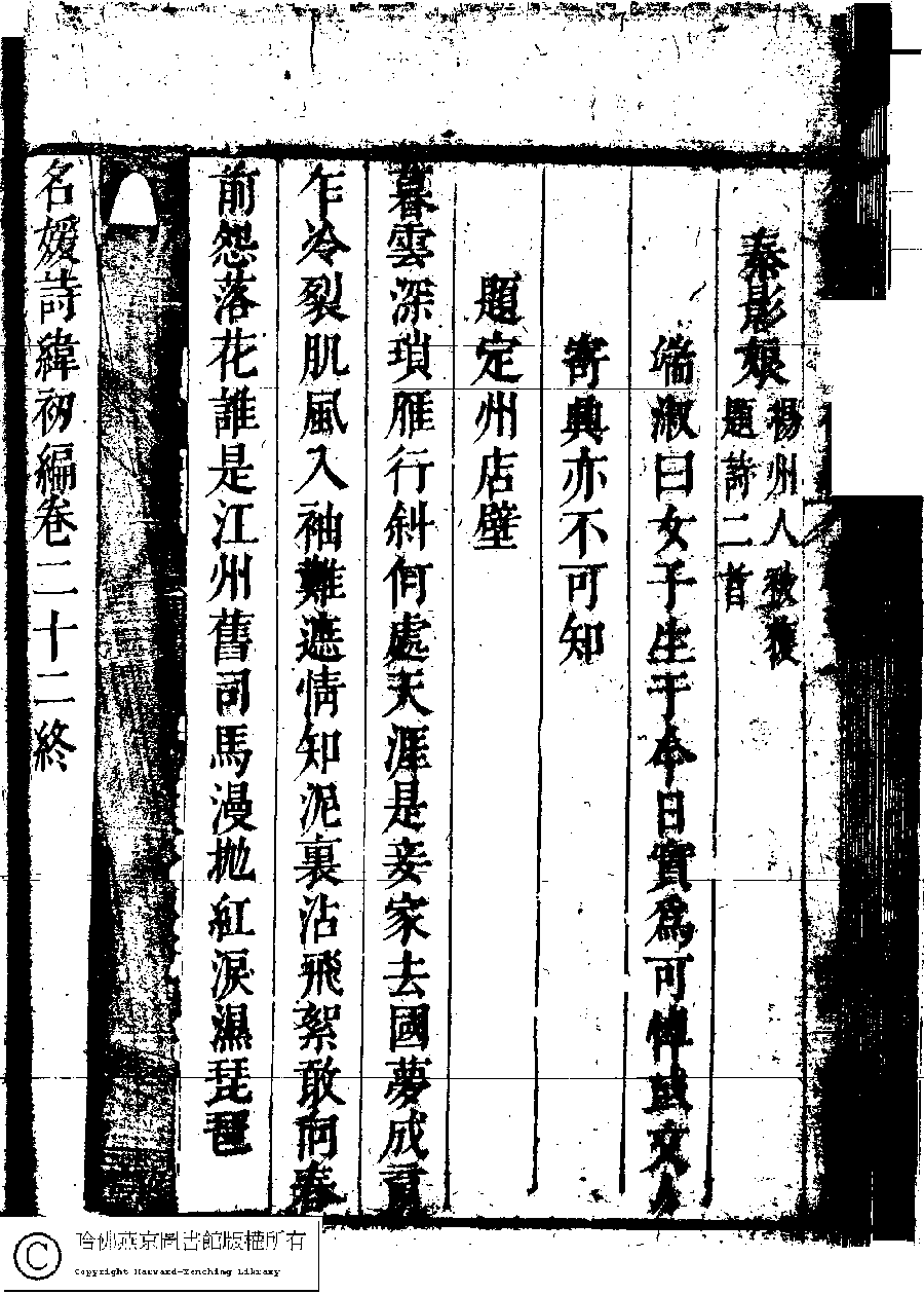 | (PRINT FRIENDLY VERSION) 名媛詩緯初編(清王端淑輯)。清康熙六年(1667)清音堂刻本 ![]() Page : 21.12b | click for larger image | Back |