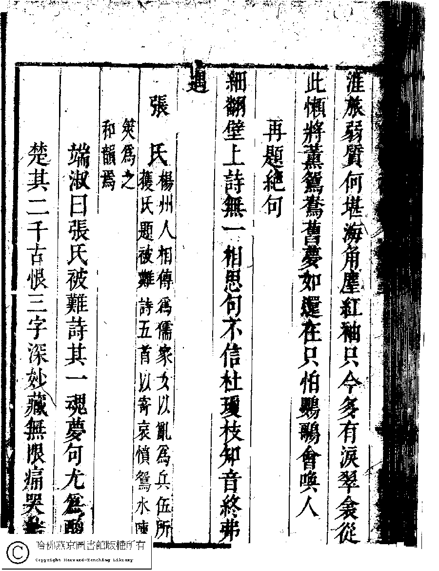 | (PRINT FRIENDLY VERSION) 名媛詩緯初編(清王端淑輯)。清康熙六年(1667)清音堂刻本 ![]() Page : 22.10b | click for larger image | Back |