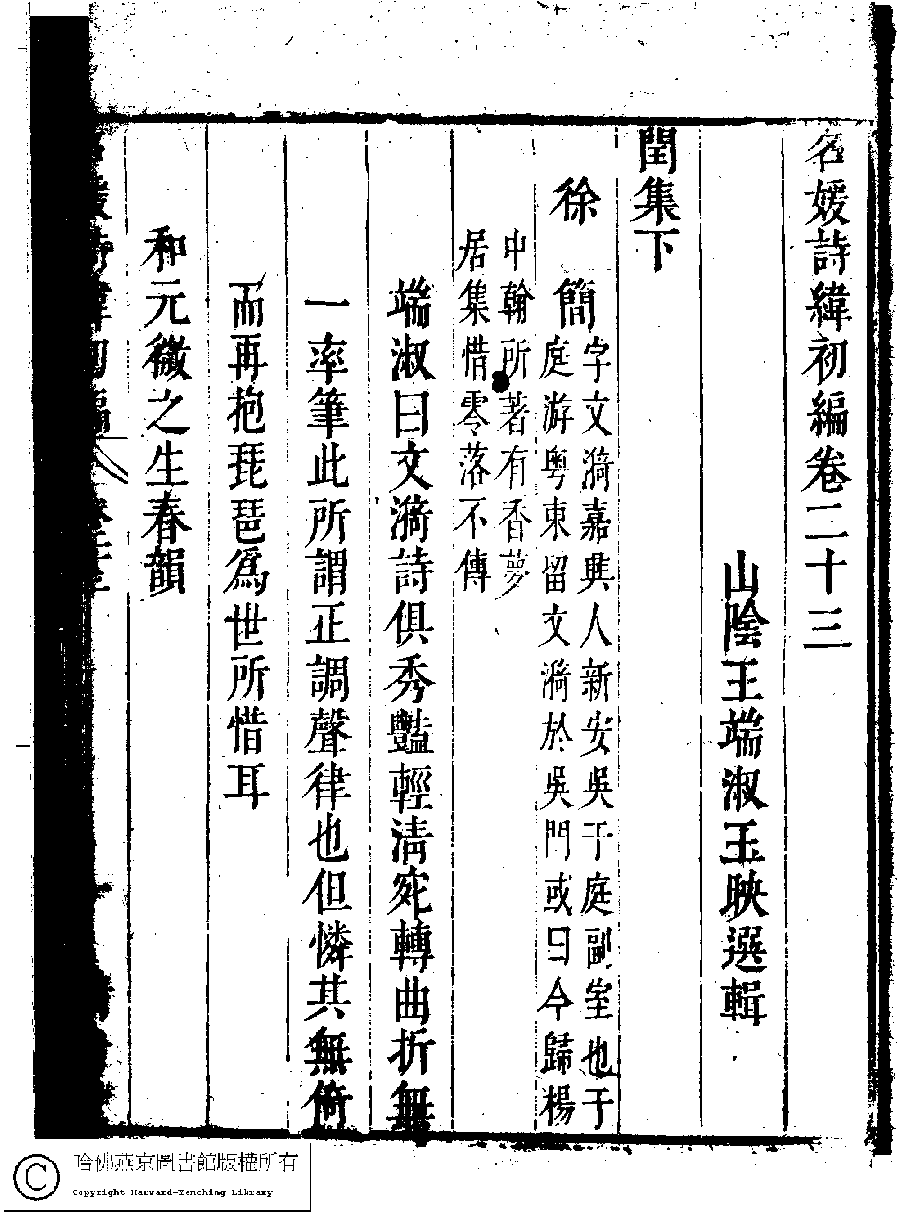 | (PRINT FRIENDLY VERSION) 名媛詩緯初編(清王端淑輯)。清康熙六年(1667)清音堂刻本 ![]() Page : 23.1a | click for larger image | Back |