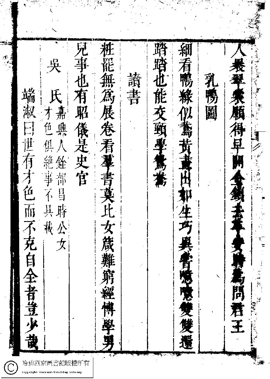 | (PRINT FRIENDLY VERSION) 名媛詩緯初編(清王端淑輯)。清康熙六年(1667)清音堂刻本 ![]() Page : 23.2b | click for larger image | Back |