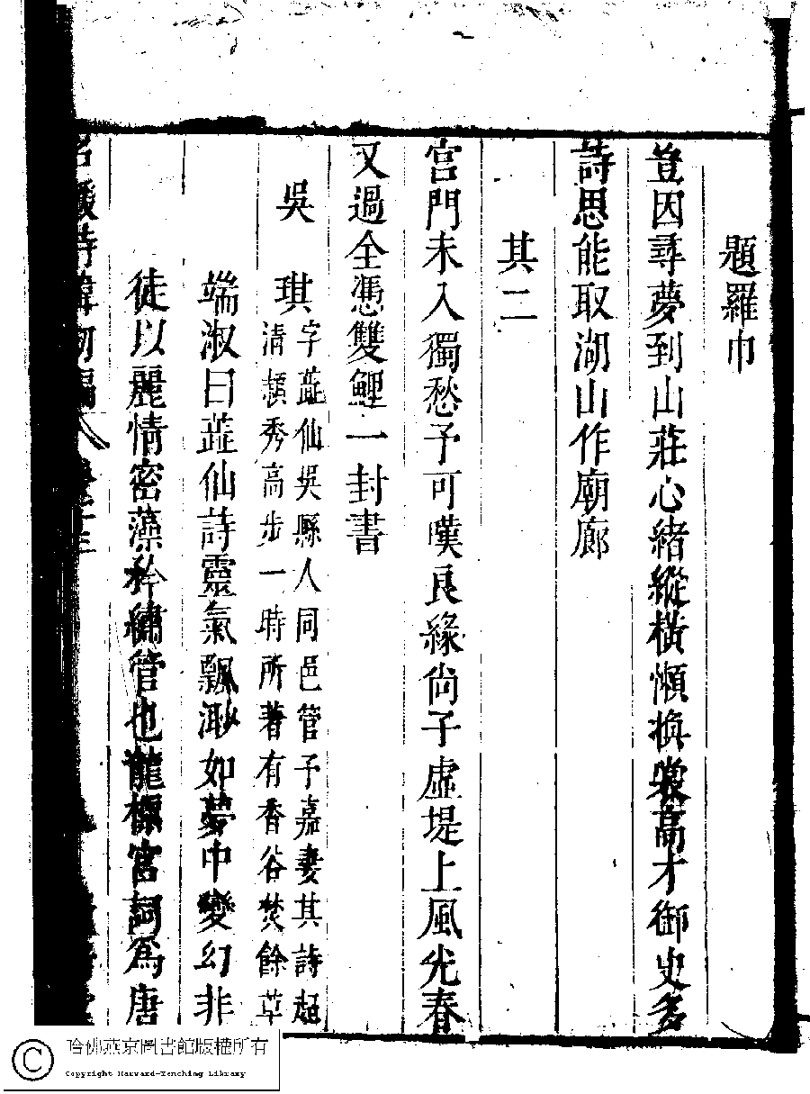 | (PRINT FRIENDLY VERSION) 名媛詩緯初編(清王端淑輯)。清康熙六年(1667)清音堂刻本 ![]() Page : 23.8a | click for larger image | Back |