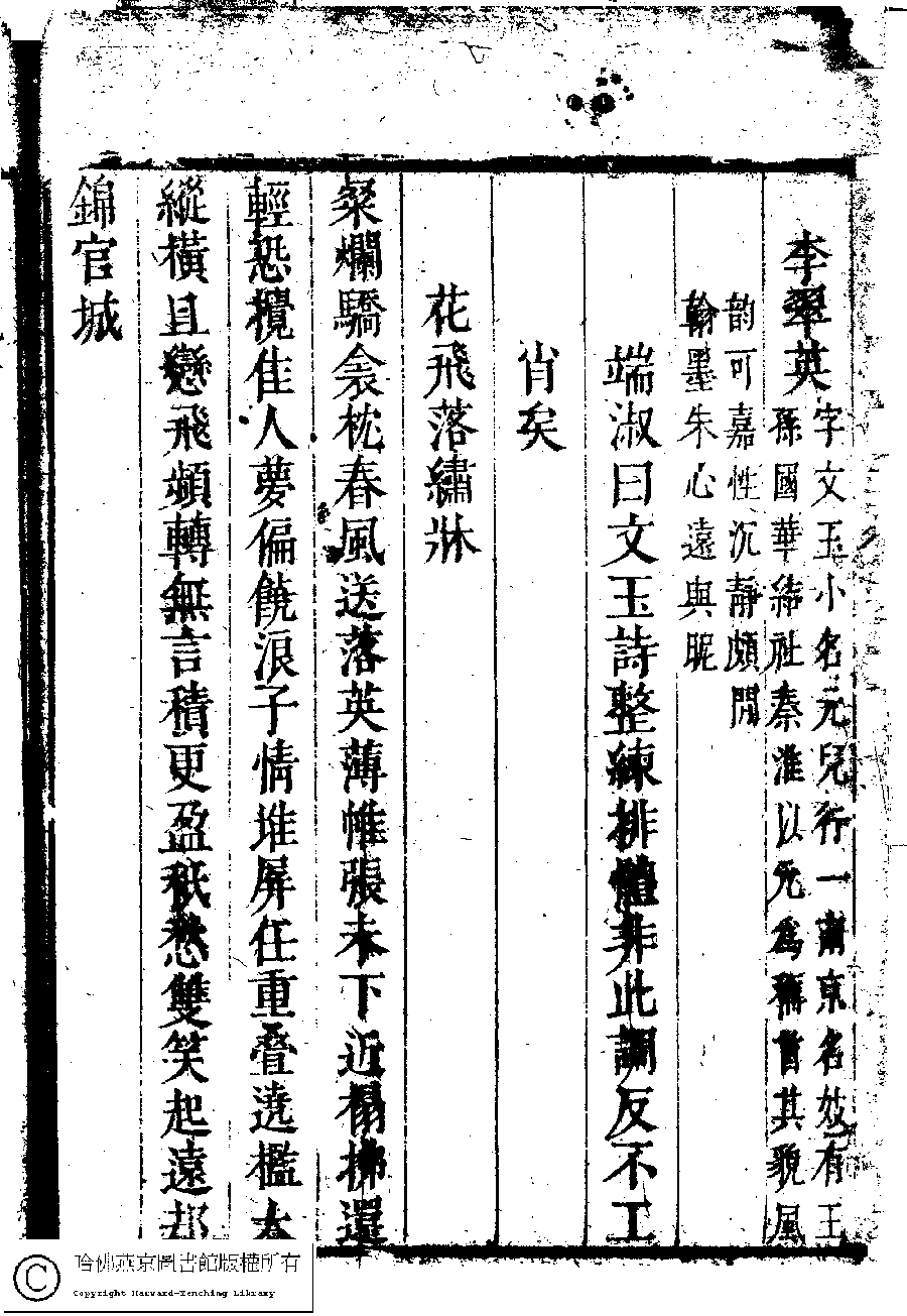 | (PRINT FRIENDLY VERSION) 名媛詩緯初編(清王端淑輯)。清康熙六年(1667)清音堂刻本 ![]() Page : 24.6b | click for larger image | Back |