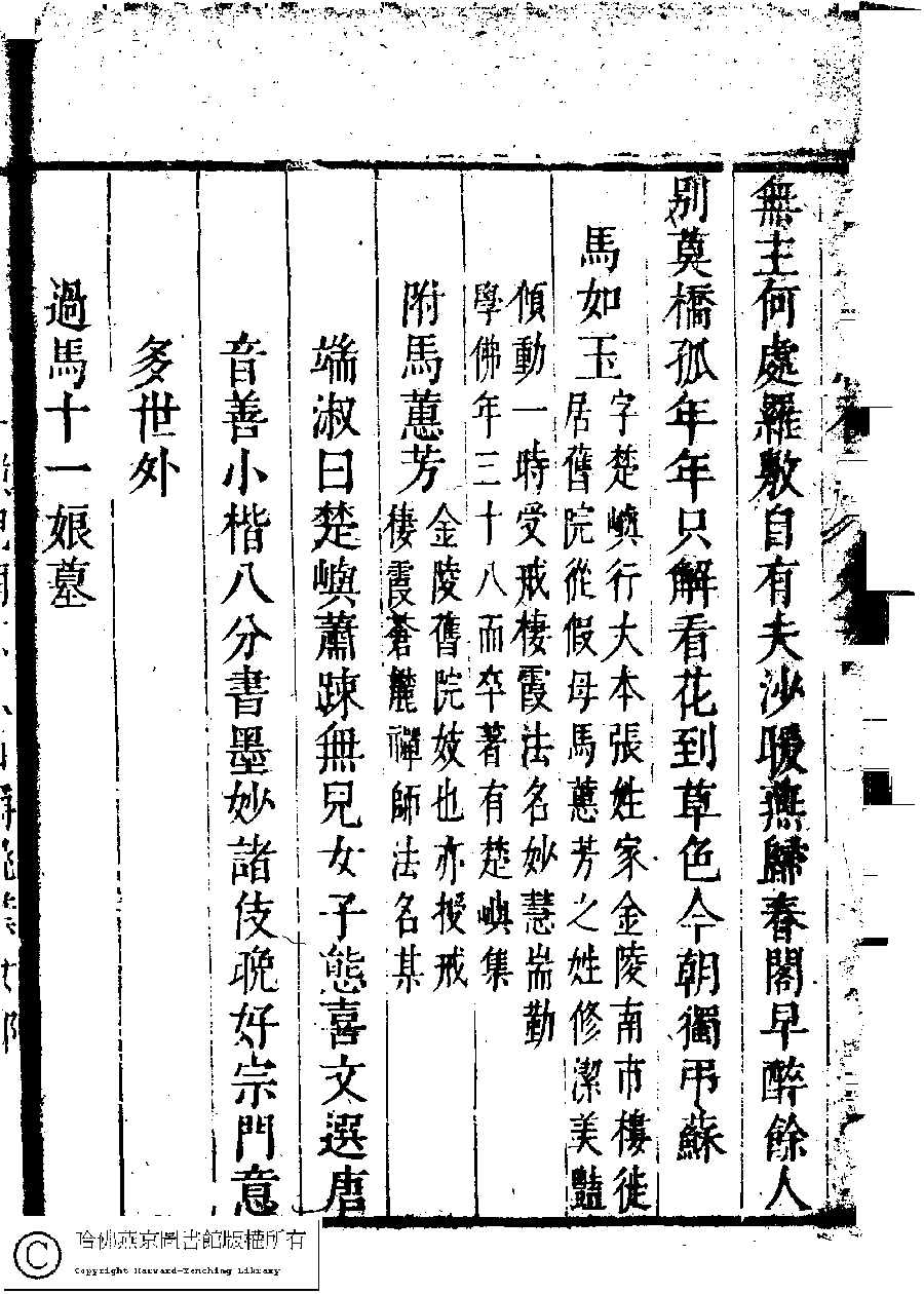 | (PRINT FRIENDLY VERSION) 名媛詩緯初編(清王端淑輯)。清康熙六年(1667)清音堂刻本 ![]() Page : 24.19b | click for larger image | Back |