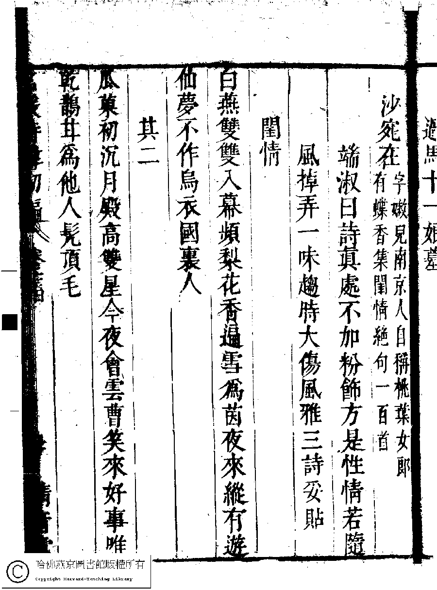 | (PRINT FRIENDLY VERSION) 名媛詩緯初編(清王端淑輯)。清康熙六年(1667)清音堂刻本 ![]() Page : 24.20a | click for larger image | Back |
