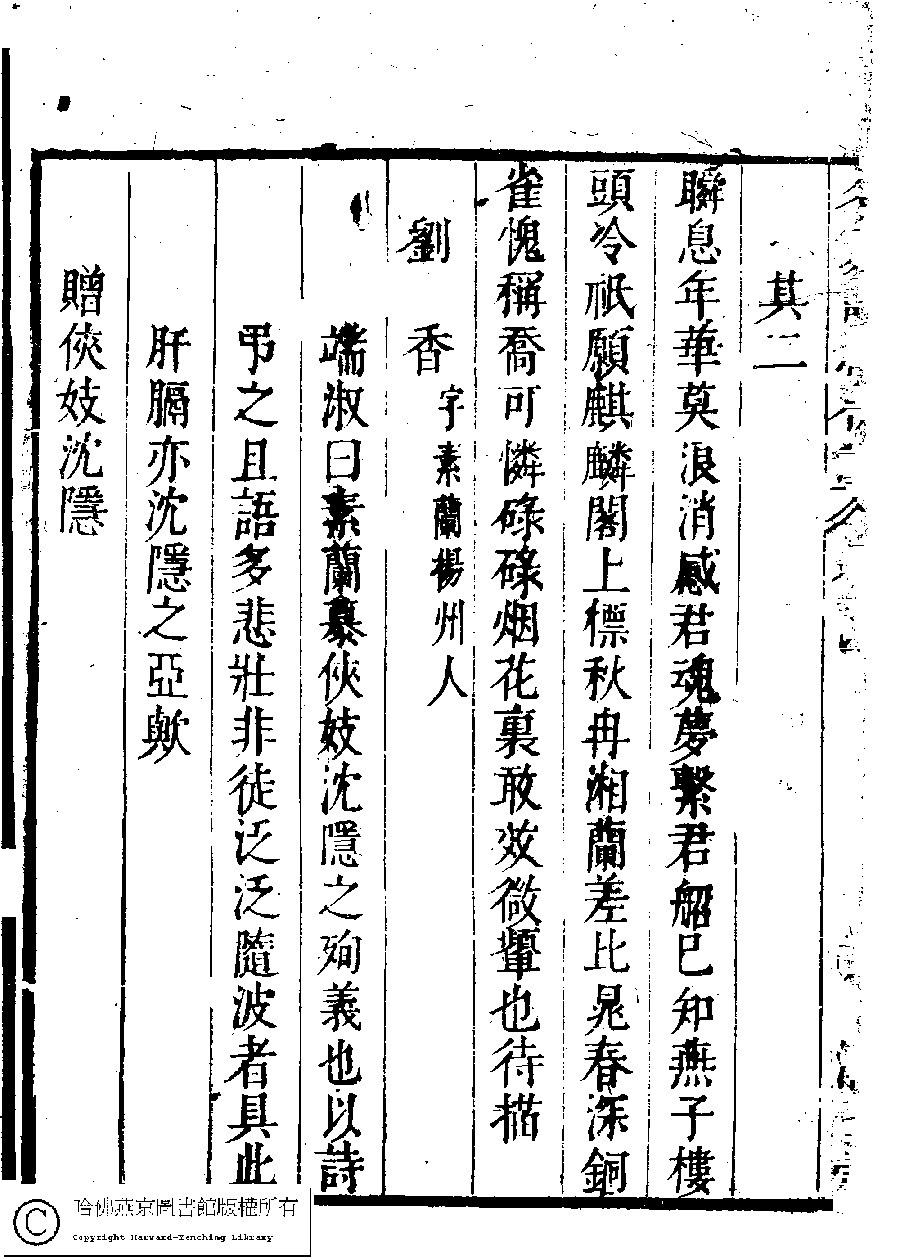| (PRINT FRIENDLY VERSION) 名媛詩緯初編(清王端淑輯)。清康熙六年(1667)清音堂刻本 ![]() Page : 24.26b | click for larger image | Back |