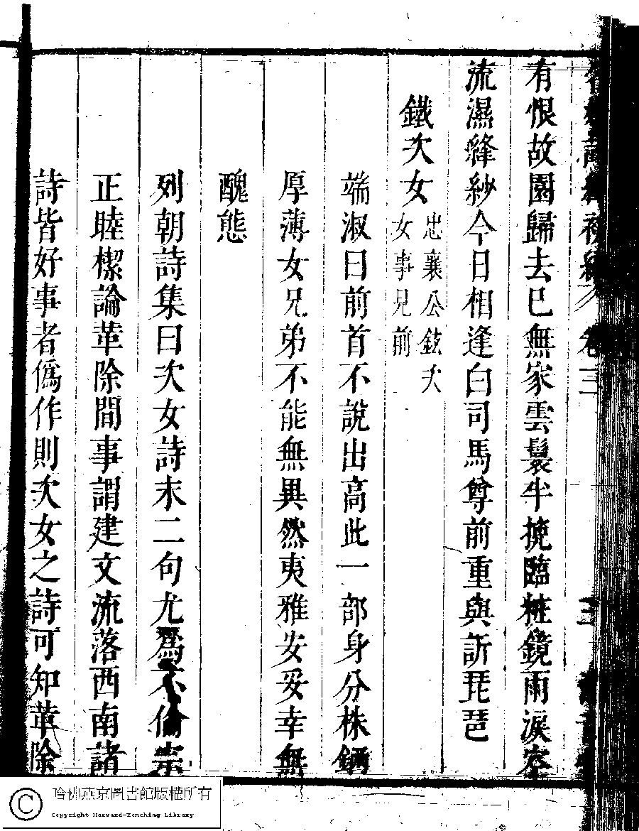 | (PRINT FRIENDLY VERSION) 名媛詩緯初編(清王端淑輯)。清康熙六年(1667)清音堂刻本 ![]() Page : 3.4a | click for larger image | 名媛詩緯初編(清王端淑輯)。清康熙六年(1667)清音堂刻本![]() Page : 3.3b | click for larger image | Back |