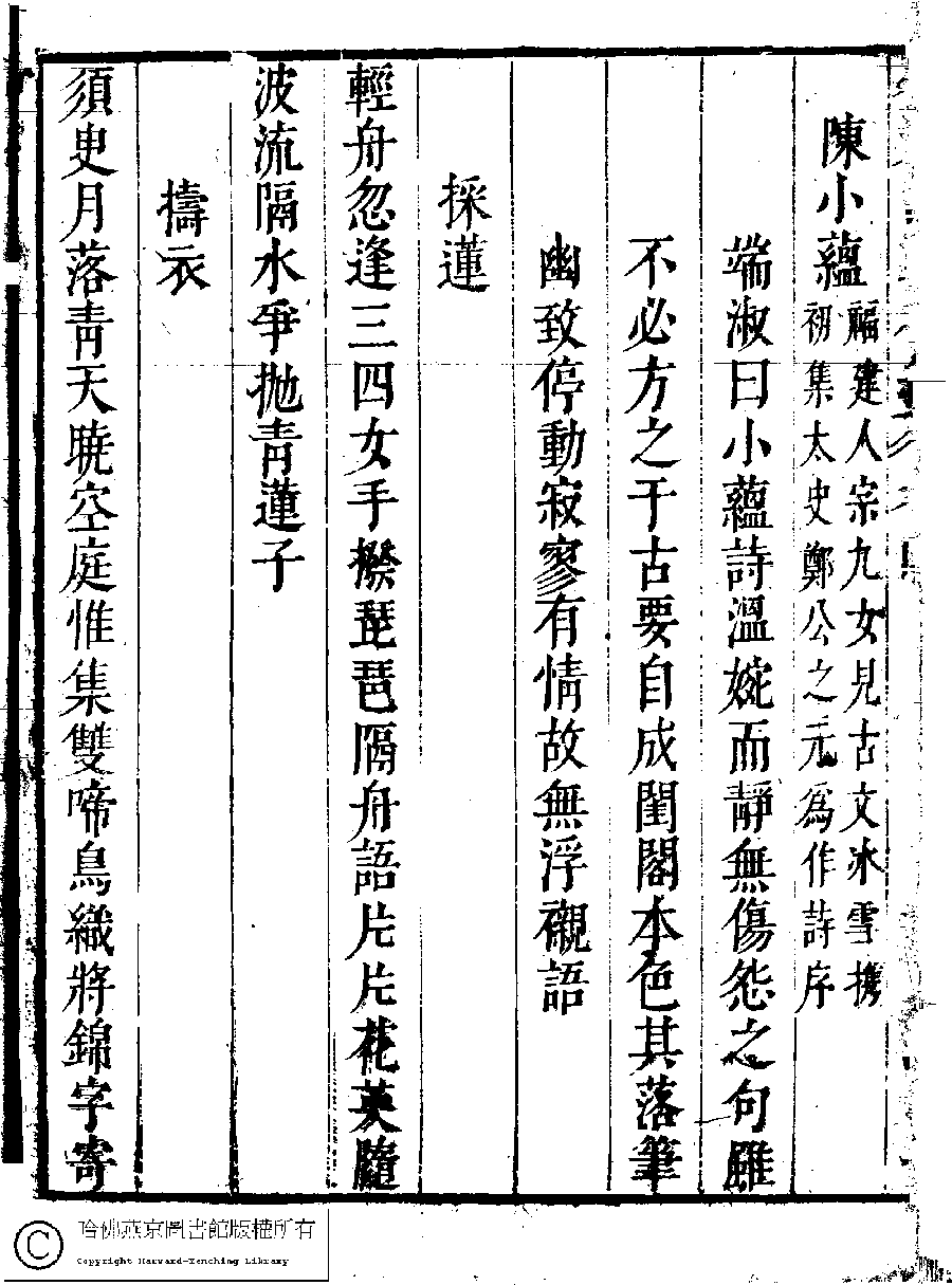 | (PRINT FRIENDLY VERSION) 名媛詩緯初編(清王端淑輯)。清康熙六年(1667)清音堂刻本 ![]() Page : 4.25b | click for larger image | Back |