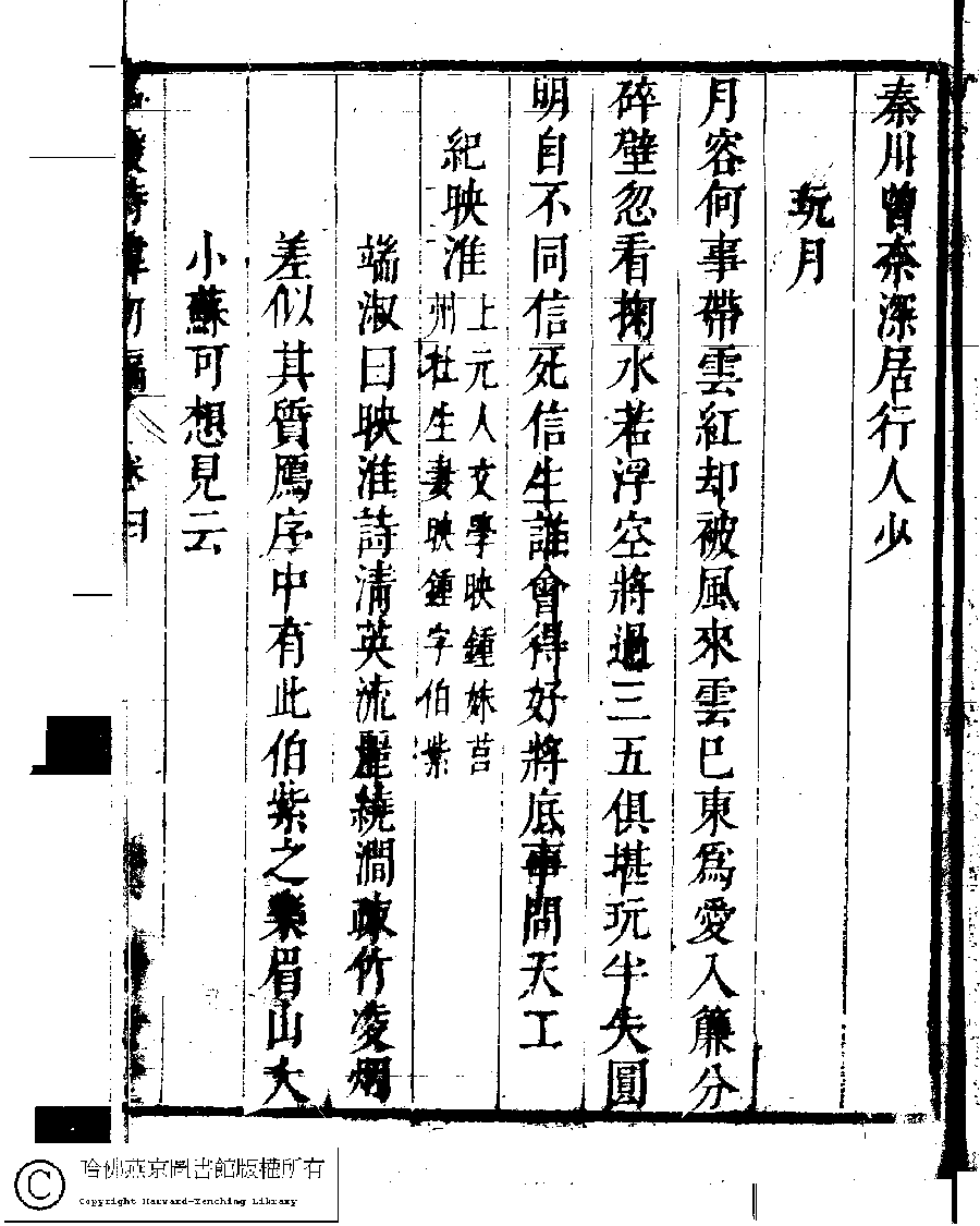 | (PRINT FRIENDLY VERSION) 名媛詩緯初編(清王端淑輯)。清康熙六年(1667)清音堂刻本 ![]() Page : 4.26a | click for larger image | Back |