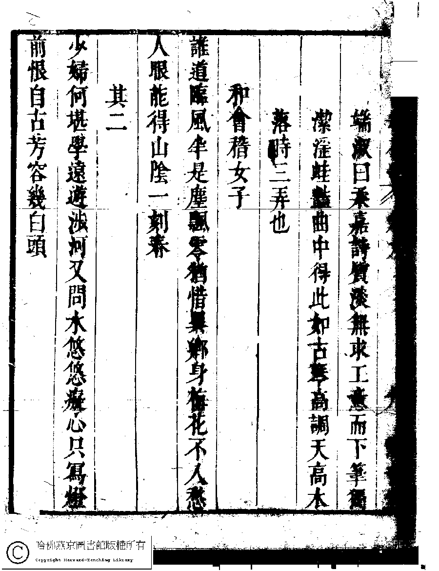 | (PRINT FRIENDLY VERSION) 名媛詩緯初編(清王端淑輯)。清康熙六年(1667)清音堂刻本 ![]() Page : 9.9b | click for larger image | Back |